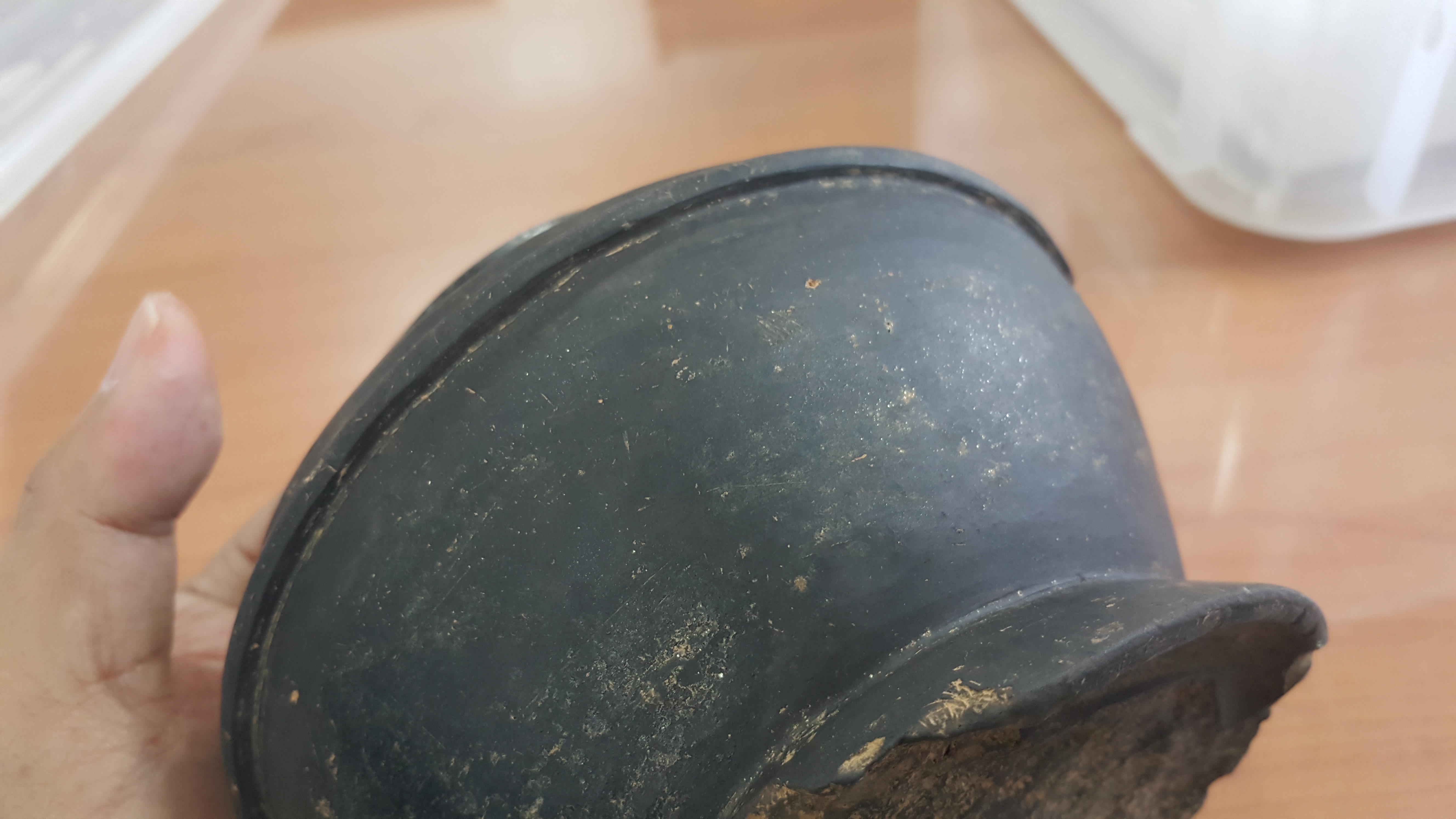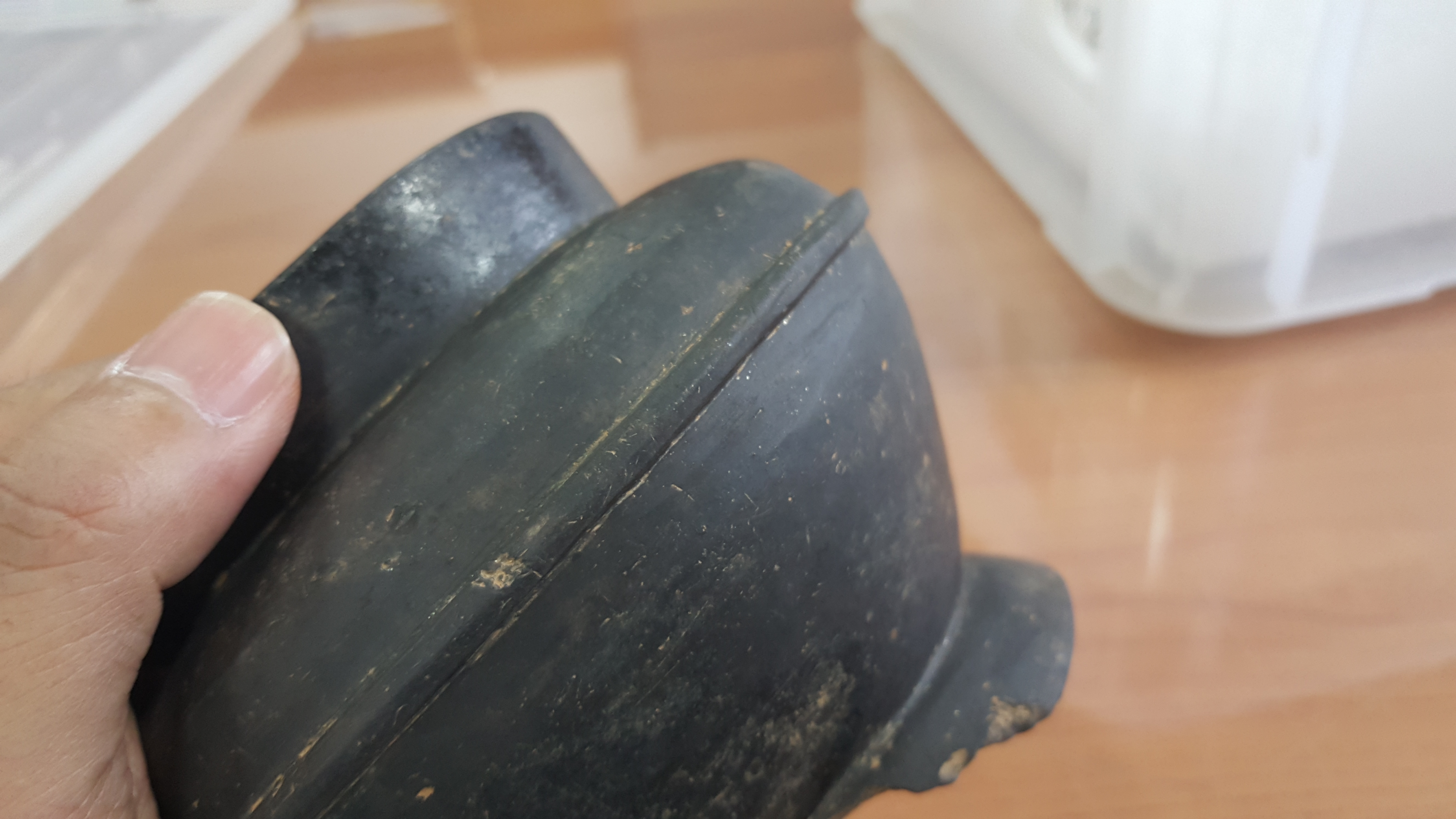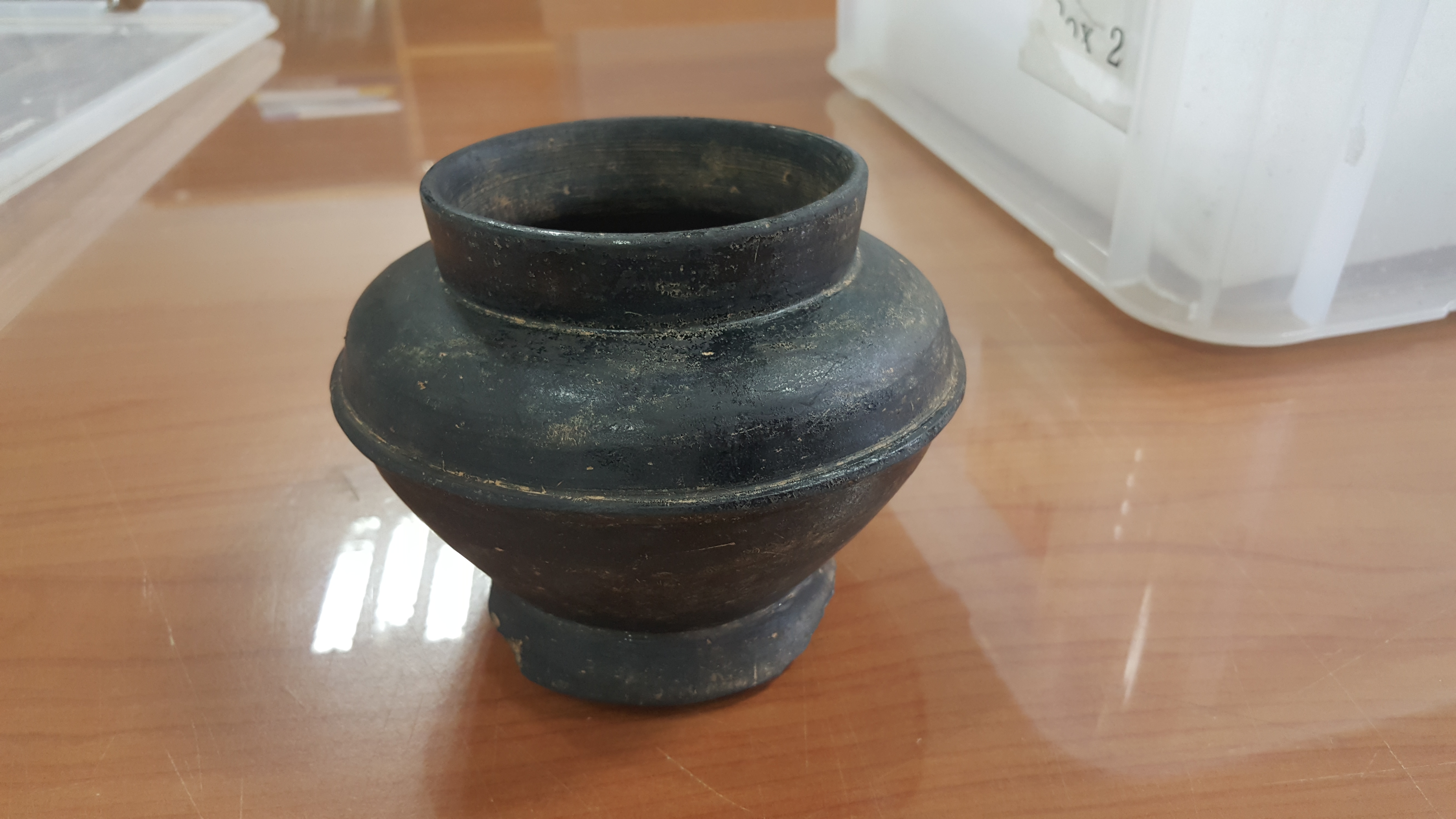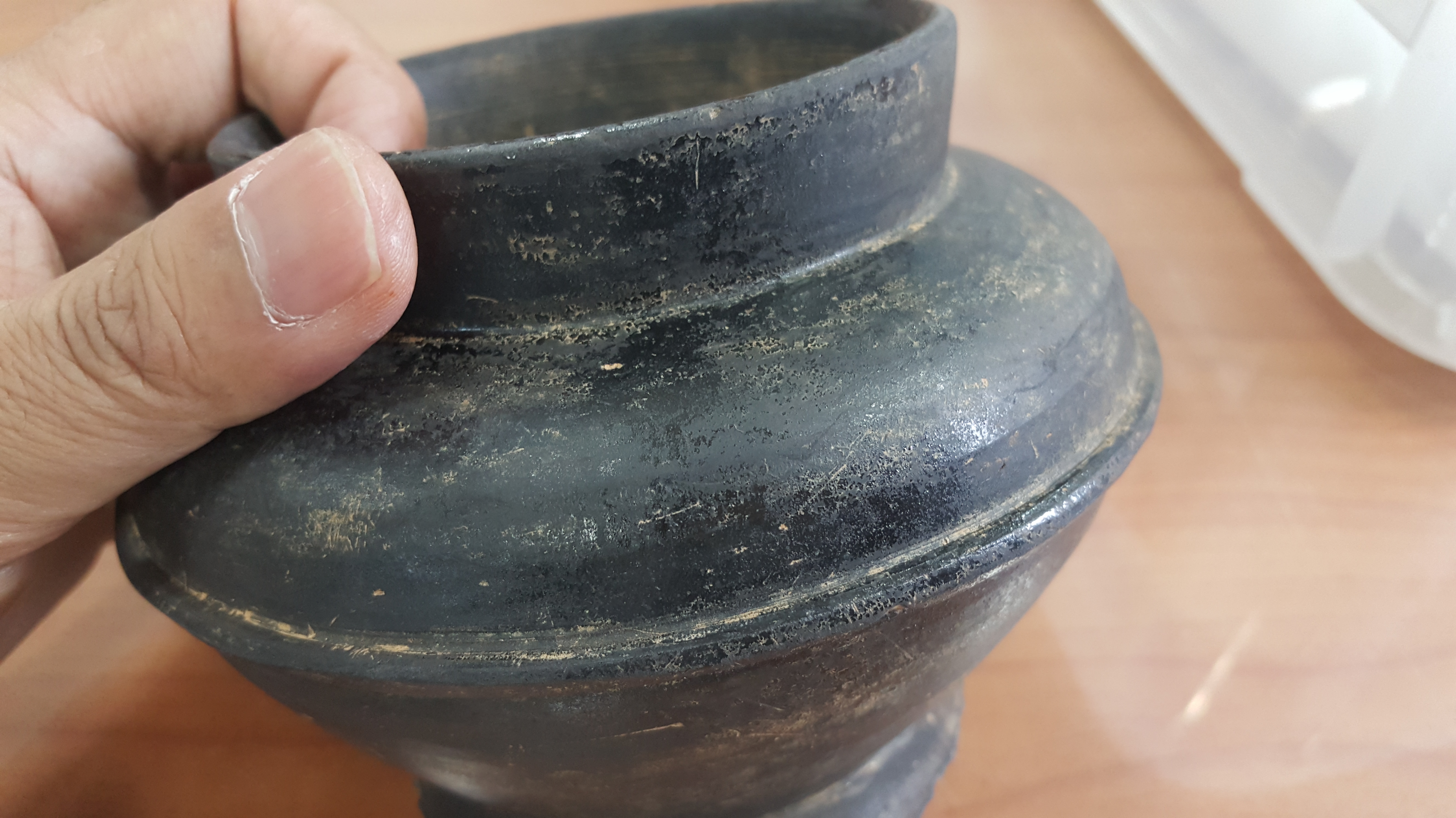 외장하드에 보관 중인 과거 사진들을 자주 훑어내려가는데, 휴대폰 뭉치를 뒤지다가 2017년 9월 27일 폰카가 포착한 사진 중에 문제의 저 흑색마연토기가 있음을 발견하고는 애초엔 기억에 도통 없어 당시 발굴조사단으로 보고서 작성을 위해 그 토기를 보관 중인 백제고도문화재단 출신 심상육 선생한테 이게 뭐냐 기별을 넣었더니