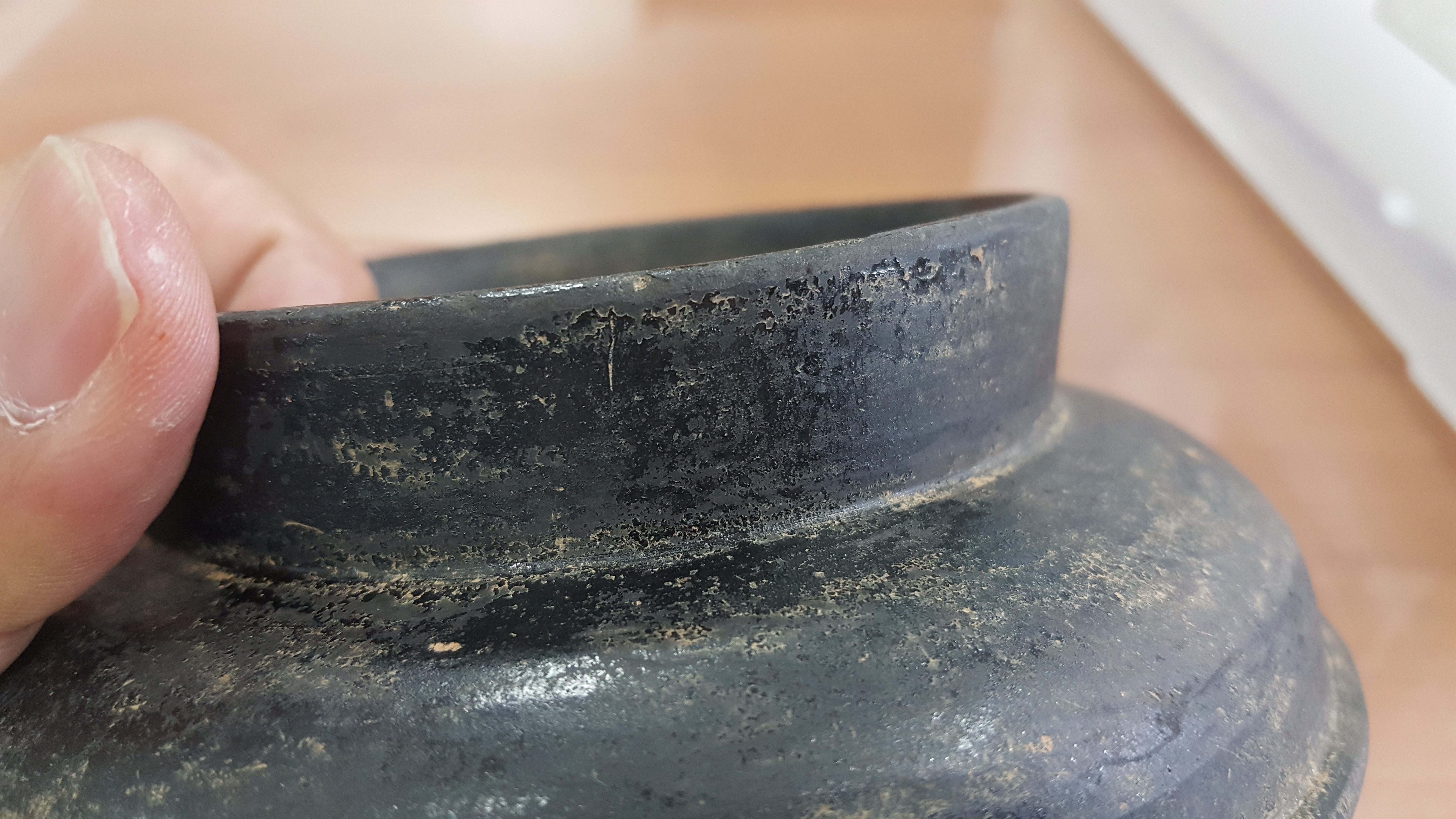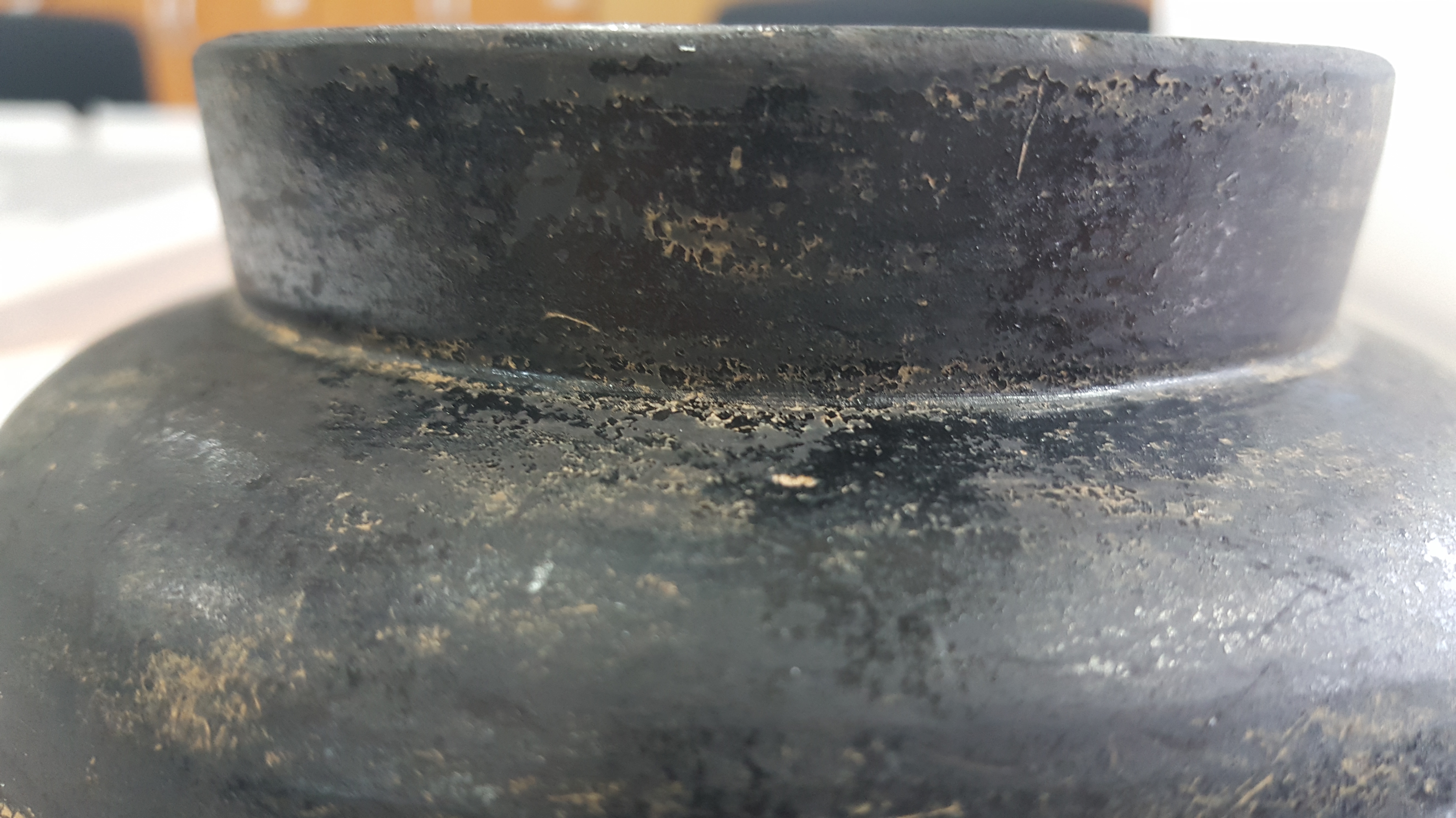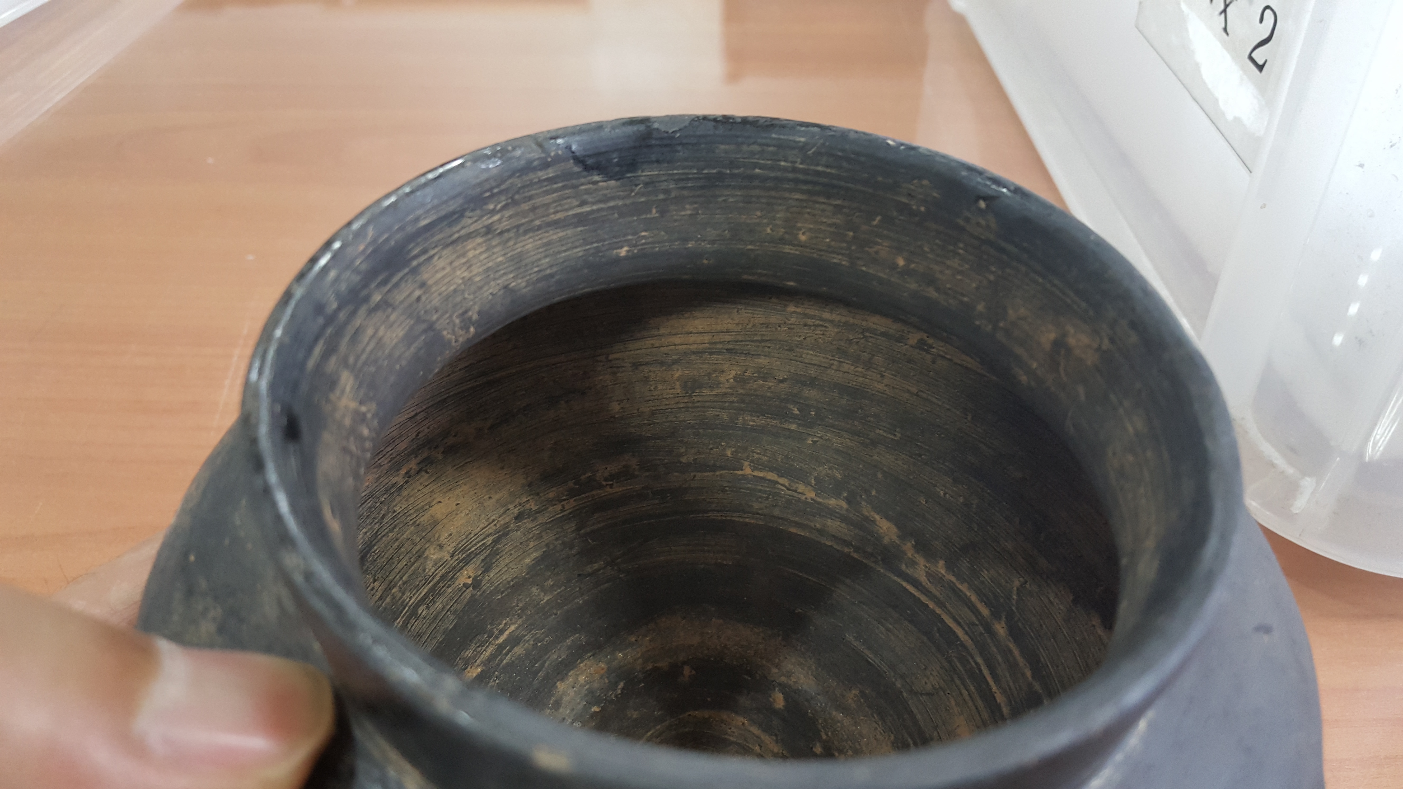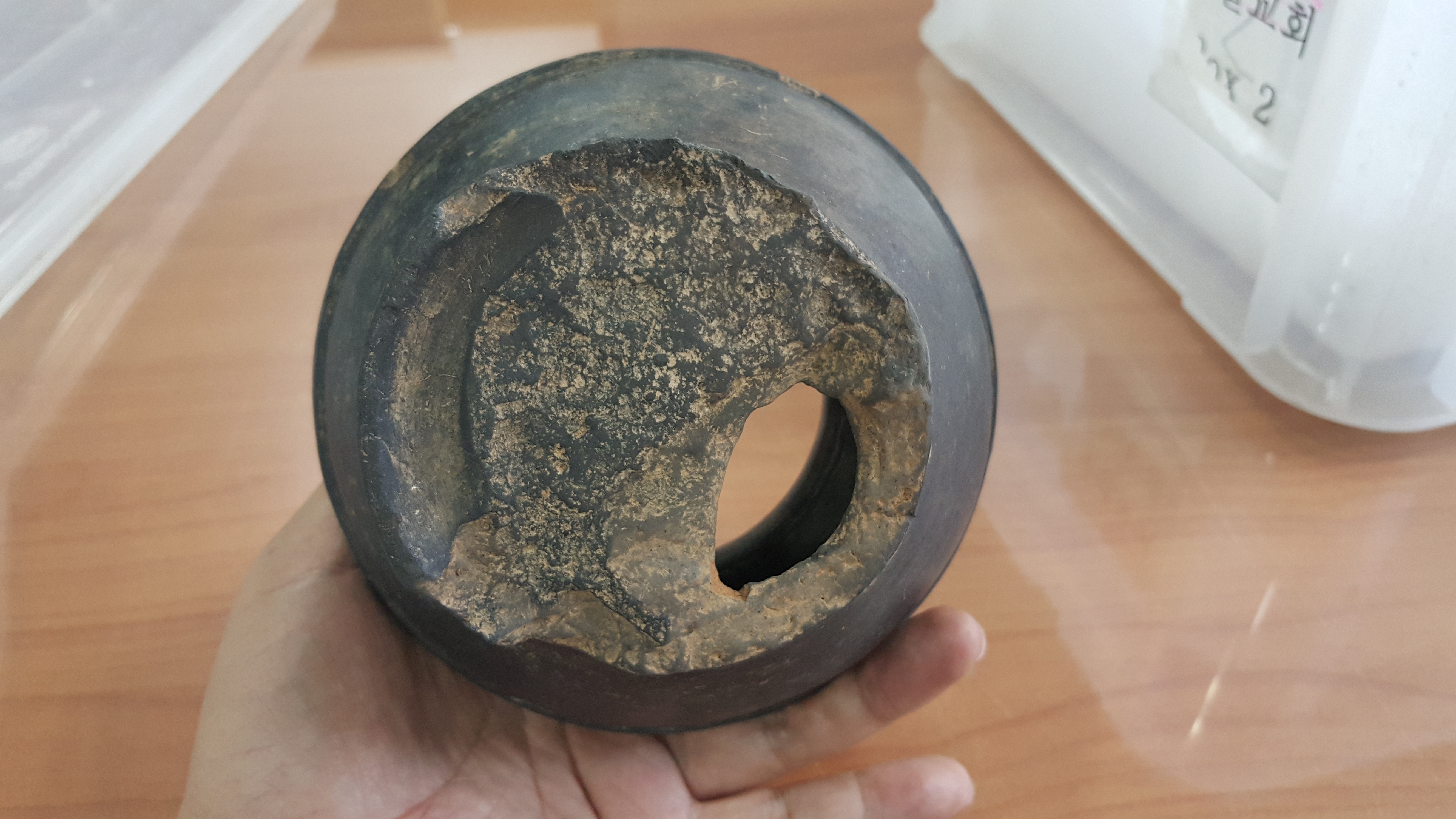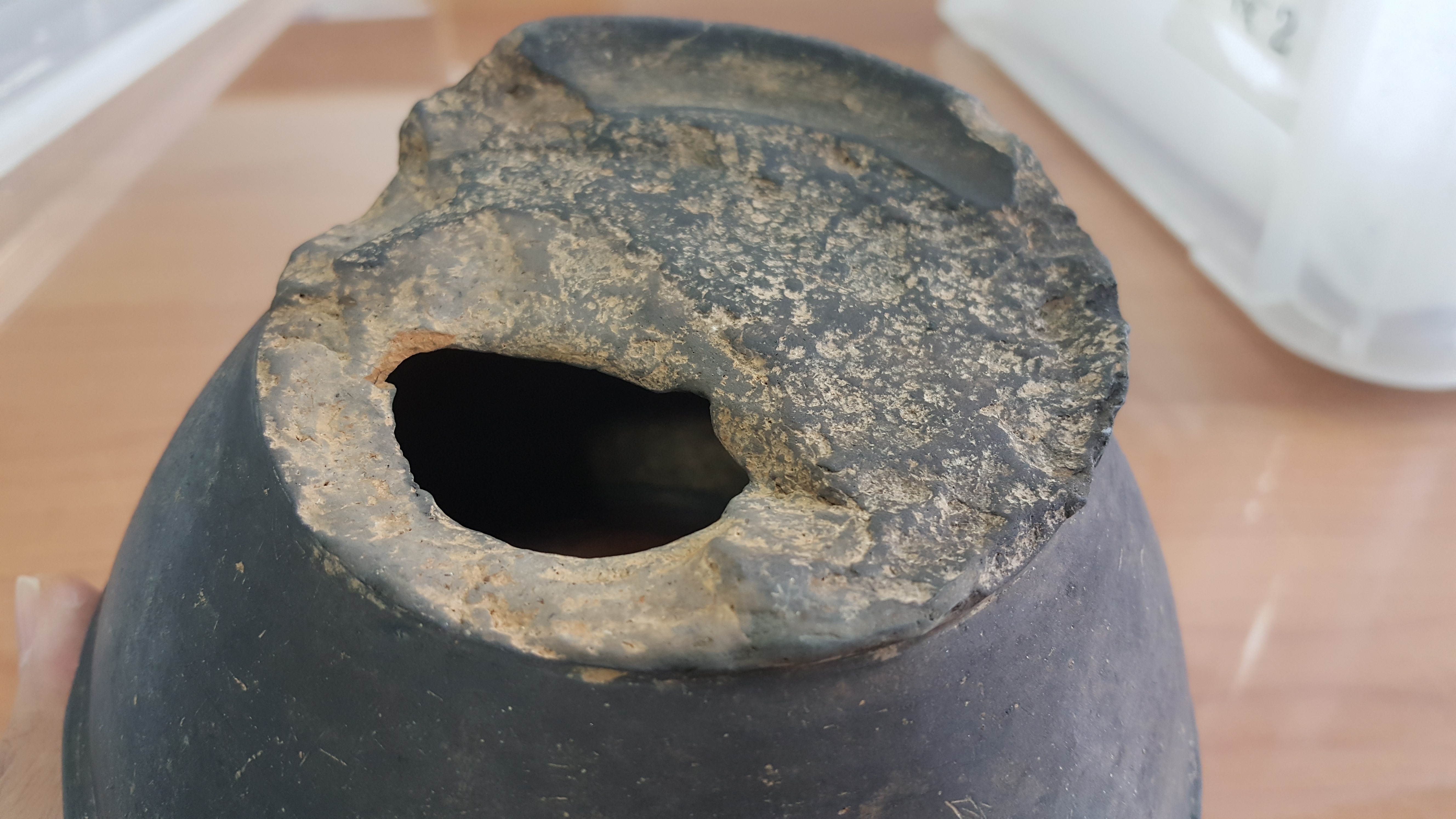 외장하드에 보관 중인 과거 사진들을 자주 훑어내려가는데, 휴대폰 뭉치를 뒤지다가 2017년 9월 27일 폰카가 포착한 사진 중에 문제의 저 흑색마연토기가 있음을 발견하고는 애초엔 기억에 도통 없어 당시 발굴조사단으로 보고서 작성을 위해 그 토기를 보관 중인 백제고도문화재단 출신 심상육 선생한테 이게 뭐냐 기별을 넣었더니