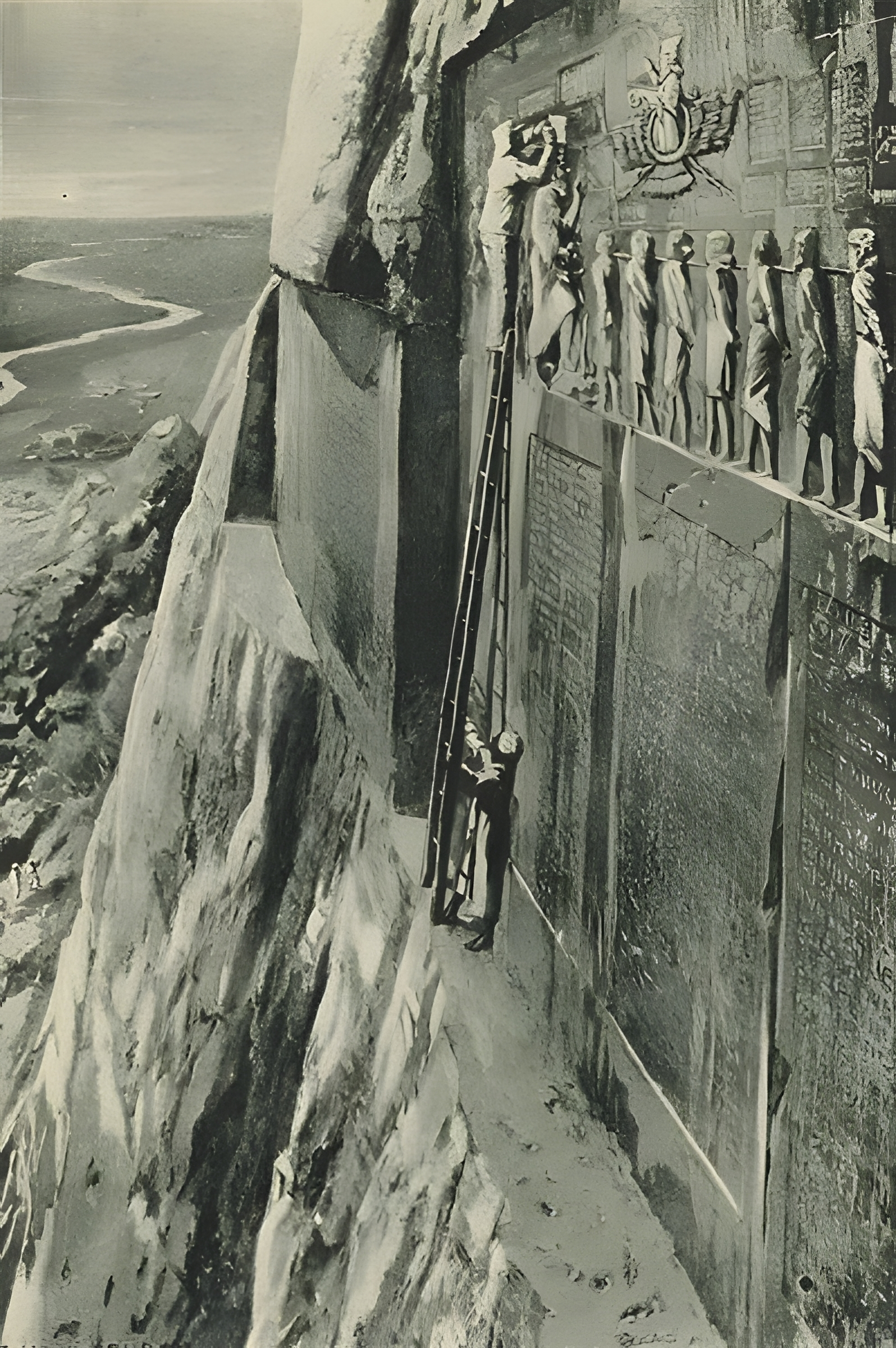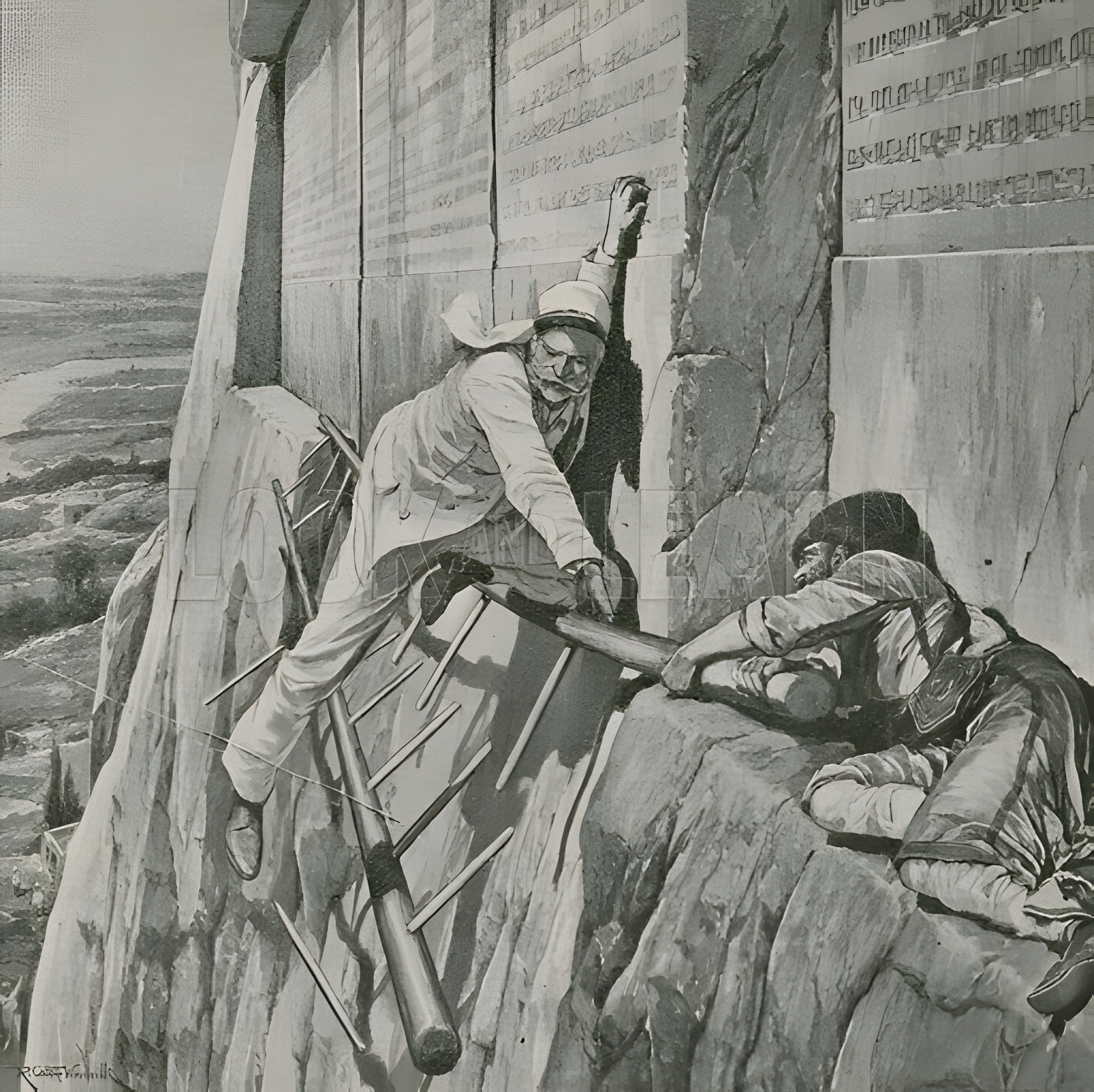 그의 초인적인 노력이야 뭐라 하겠냐마는 그 발판을 마련한 베히스툰 비문을 조사하고자 그가 저런 험준한 벼랑을 올라 그가 비문을 조사했다 해서 회화로 표현한 한 장면이다.