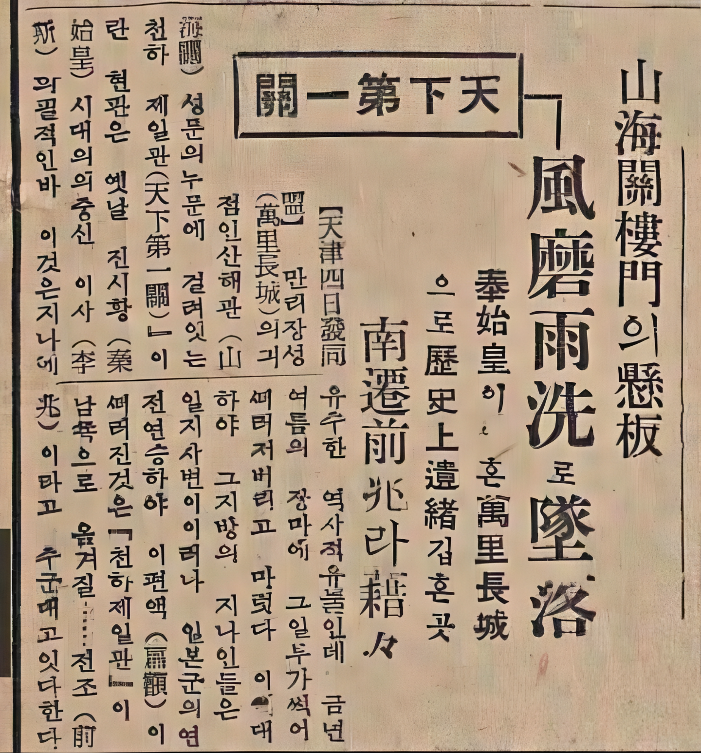 1937년 9월 6일, <매일신보每日新報>는 중국발 기사 하나를 싣는다. 장성長城의 관문 현판이 썩어서 떨어졌노라고.