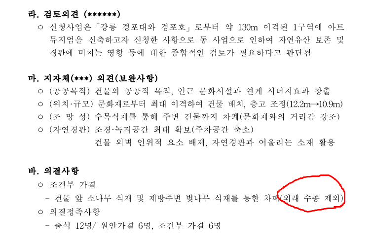 이 사업은 「강릉 경포대와 경포호」주변에다가 아트뮤지엄 신축을 신축한단 것으로, 이 사업이 명승으로 지정된 경포대 경관에 변화를 초래하므로 그에 앞서 문화재청에 이 사업을 위한 현상변경 등 허가를 신청한 것이며, 이에 문화재청은 이를 어찌하까요 해서 문화재위에다가 물은 것이니