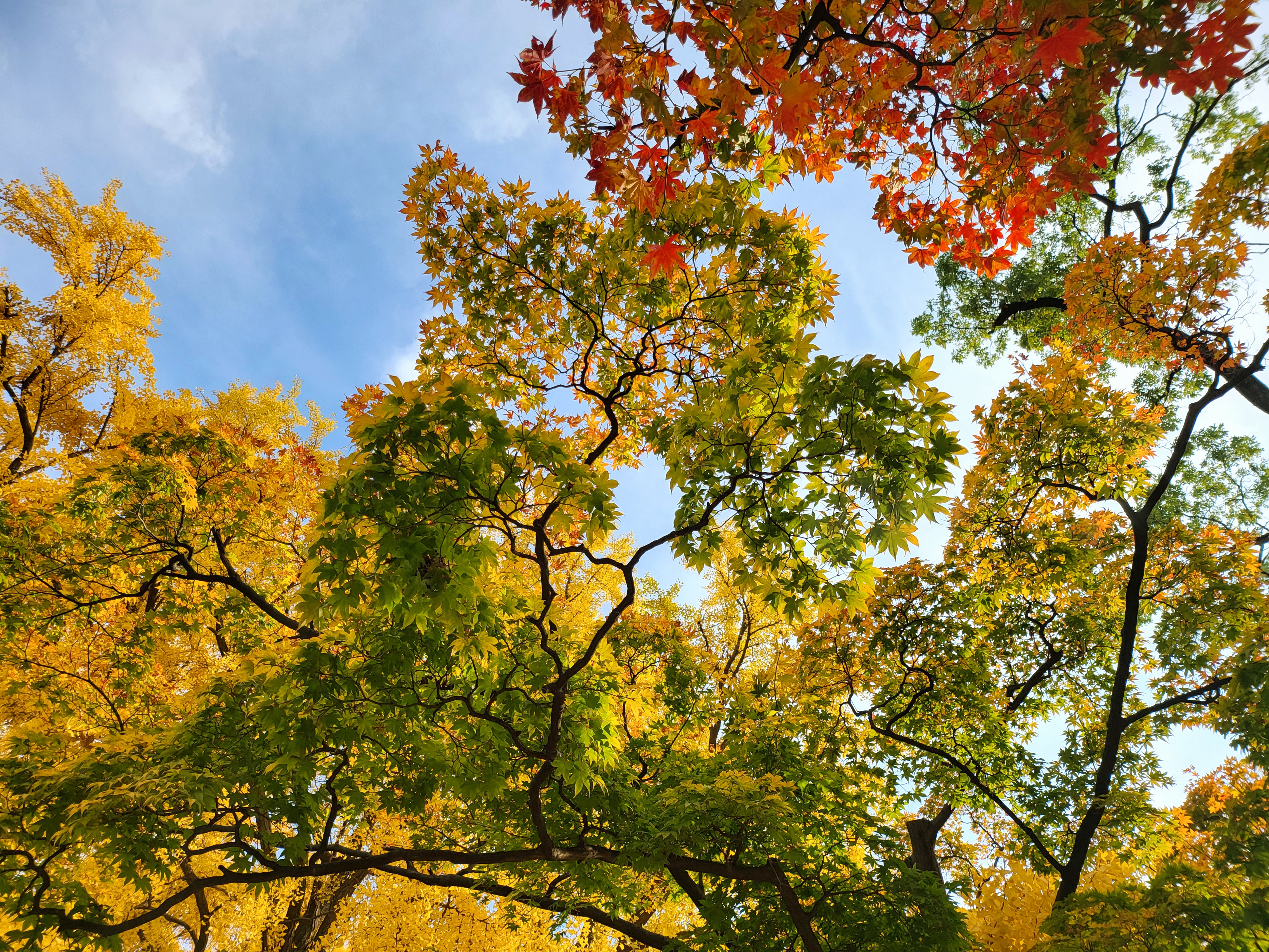 나는 은행단풍과 어우러져 그들이 빚어내는 묘한 대비를 좋아한다.