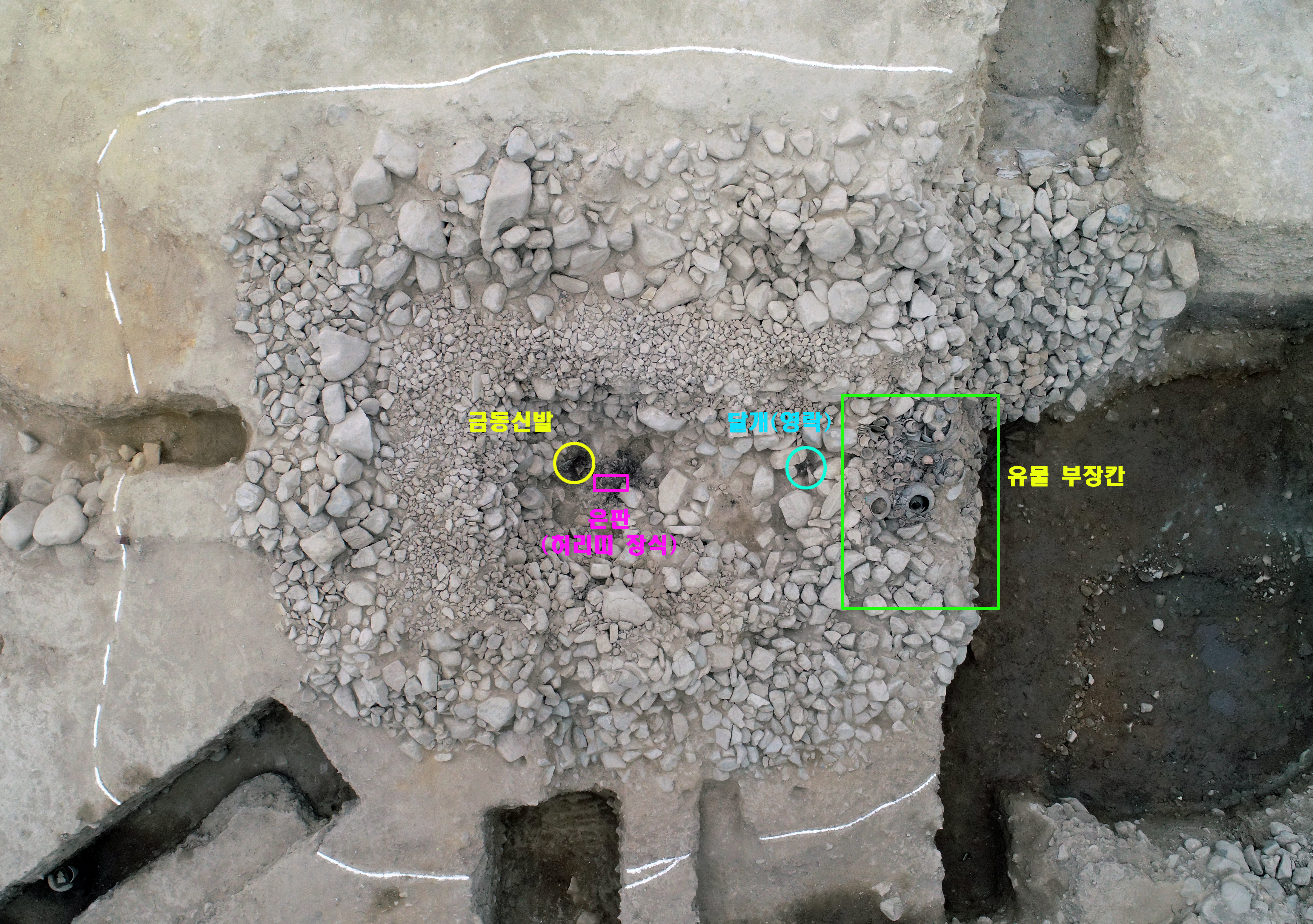 이외에, 피장자의 다리 부분에서는 허리띠 장식에 사용된 은판(銀板)이, 머리 부분에서는 신발에 달린 것처럼 여러 점의 금동 달개가 겉으로 드러나 있는 것도 확인했다. 앞으로의 발굴조사는 이 달개가 머리에 쓰는 관(冠)이나 관 꾸미개(冠飾, 관식)일 가능성을 염두에 두고 진행될 것이다.