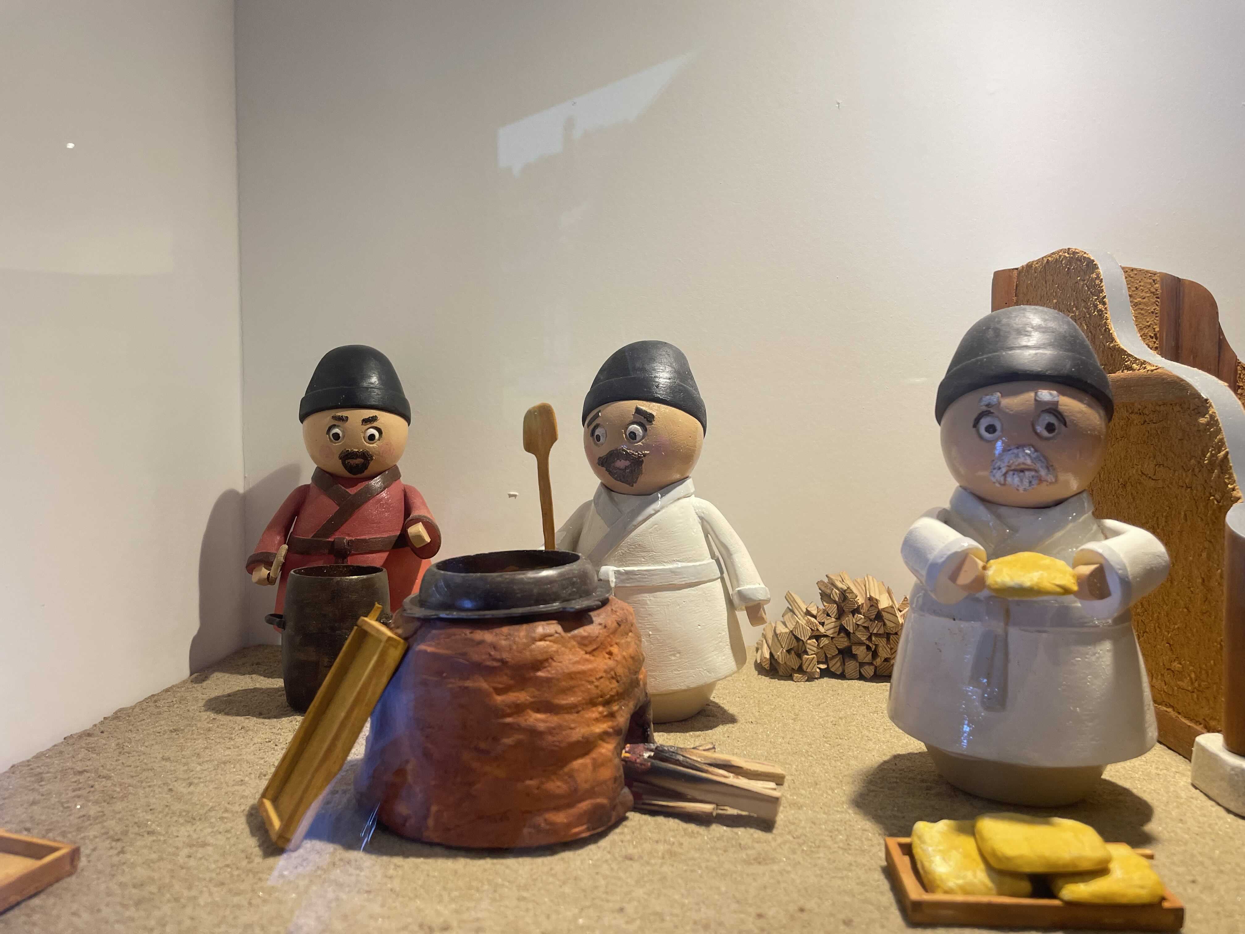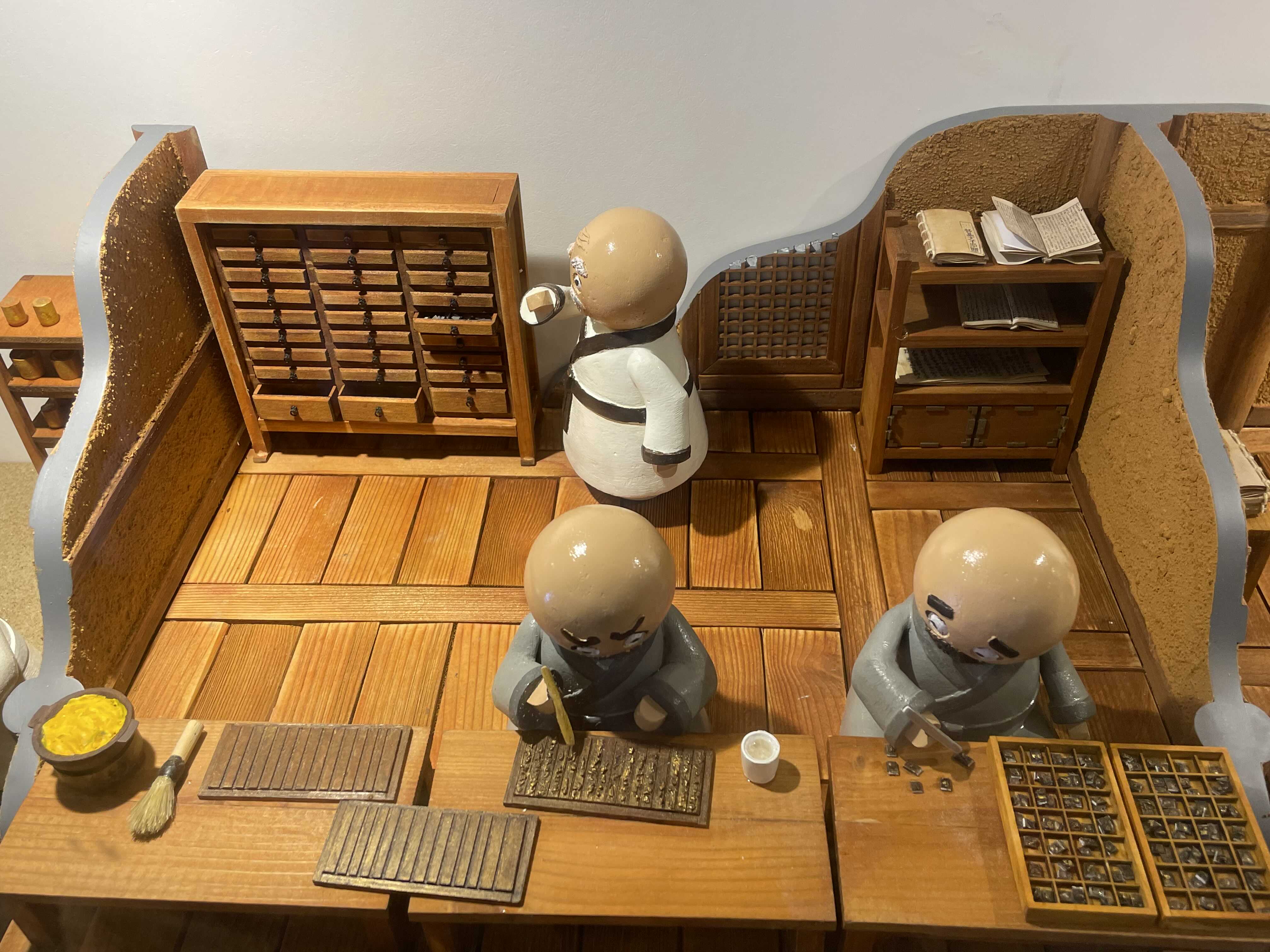 금속활자 제작 과정 일부를 모형으로 만들어 전시했습니다. 귀여운 인형들이 보입니다.
