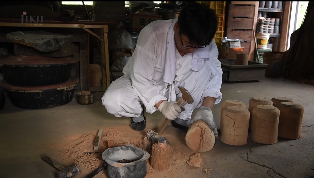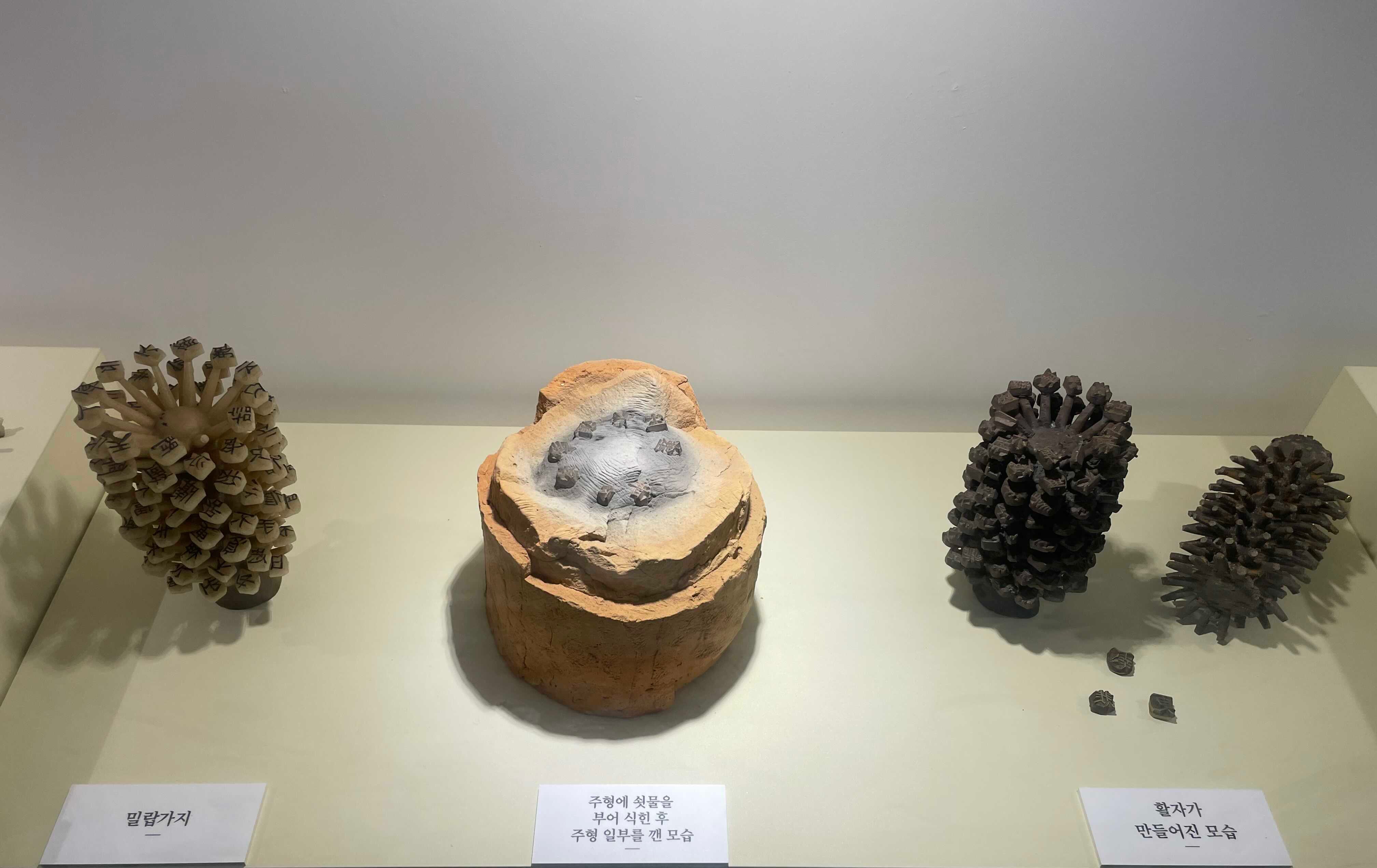 모형에는 생략되었지만, 쇳물을 부은 주형을 완전히 굳힌 다음 조심스럽게 탕탕탕 깨줍니다. 그러면 금속 활자가 까꿍! 하고 모습을 보입니다.