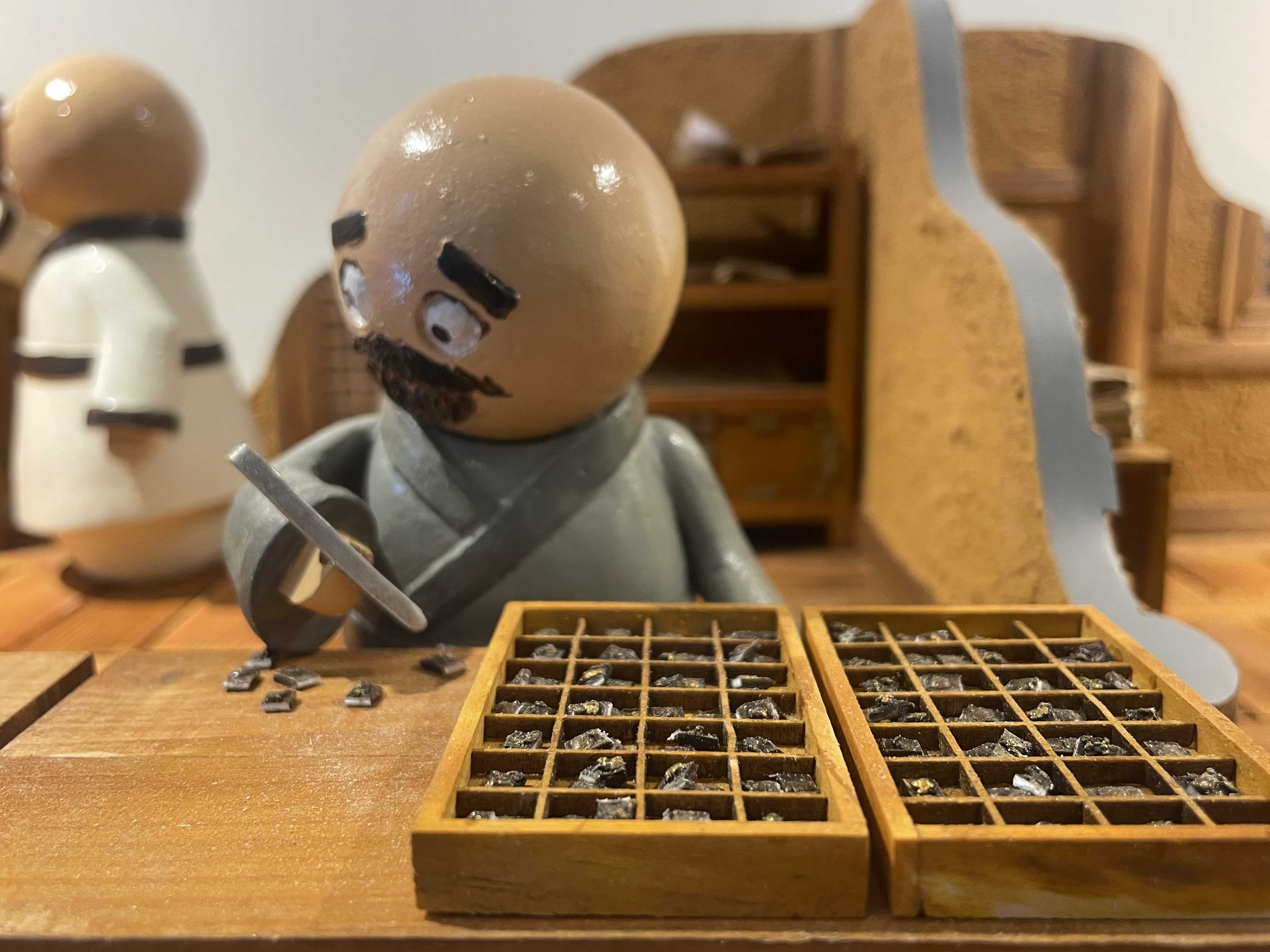 모형에는 생략되었지만, 쇳물을 부은 주형을 완전히 굳힌 다음 조심스럽게 탕탕탕 깨줍니다. 그러면 금속 활자가 까꿍! 하고 모습을 보입니다.