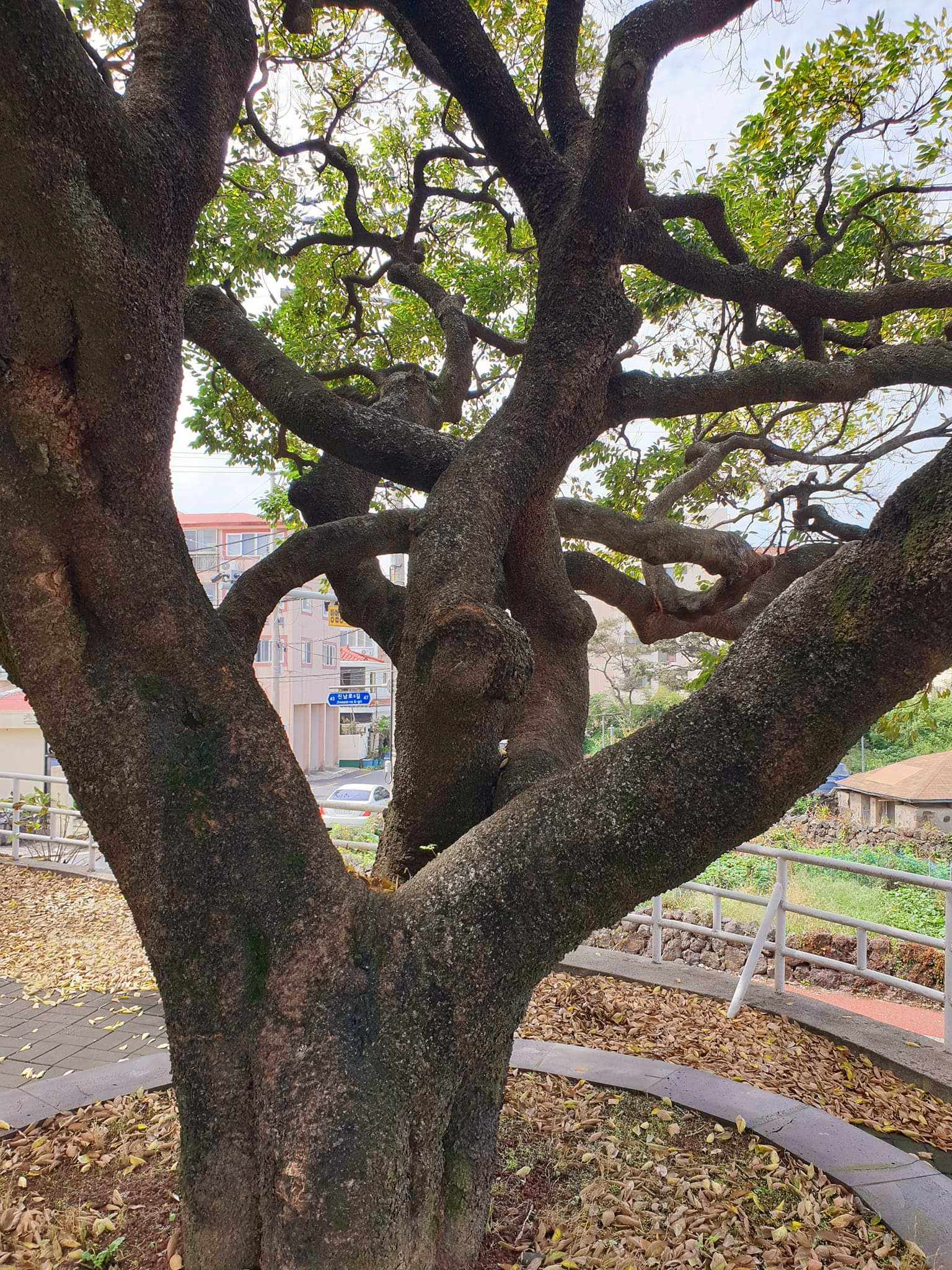 저만치 청탄 선생의 집이 내려다보이는데, 사실 집보다도 나무에 더 감탄하게 됩니다. 슬슬 제주에도 가을이 다가오는지라 누렇게 바랜 이파리가 바닥에 쌓여가는 가운데 꿈틀거리는 등걸이 당당하기만 합니다.