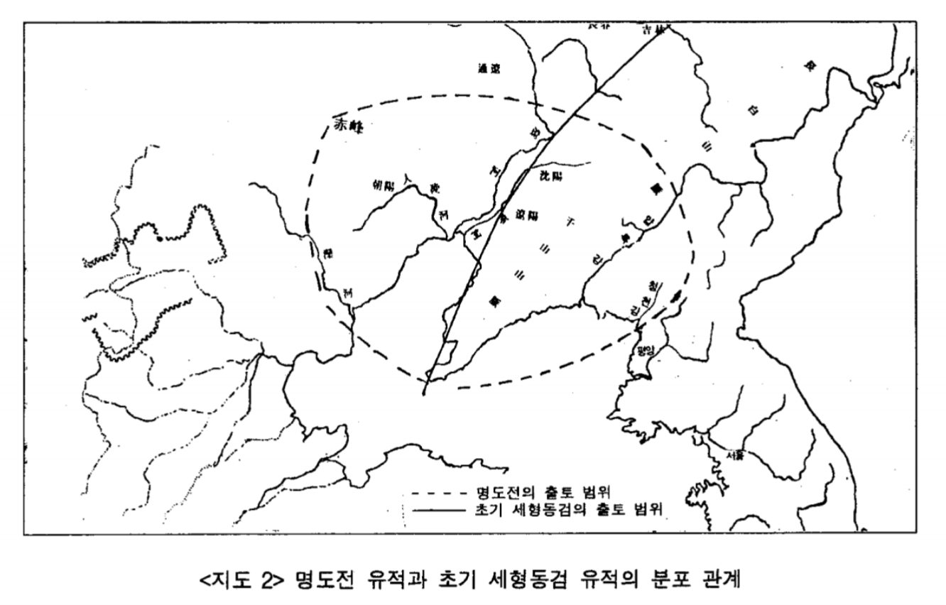 위 지도에서 보듯이 초기세형동검이라는 것, 시대로 보나 지리적으로 보나 명도전 분포와 상당히 겹치는데