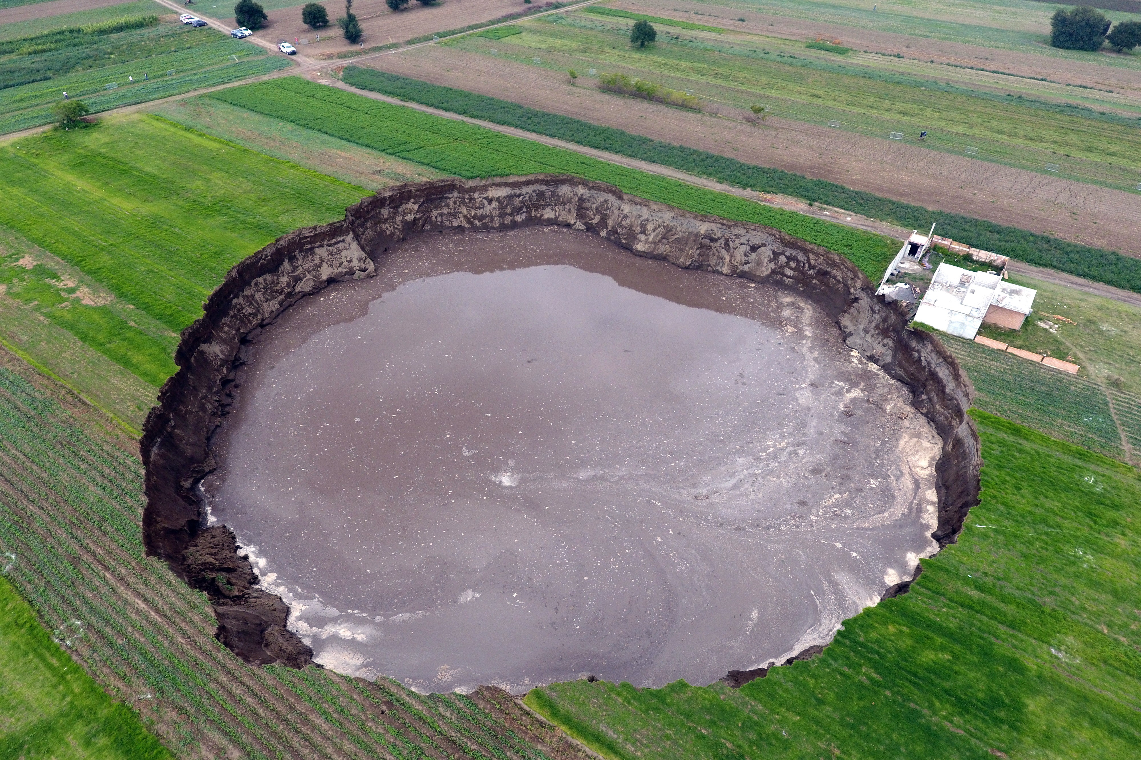 (멕시코시티=연합뉴스) 고미혜 특파원 = 멕시코 중부 마을에 생겨난 거대 싱크홀이 계속 커지며 인근 가옥과 동물을 삼키고 있다.