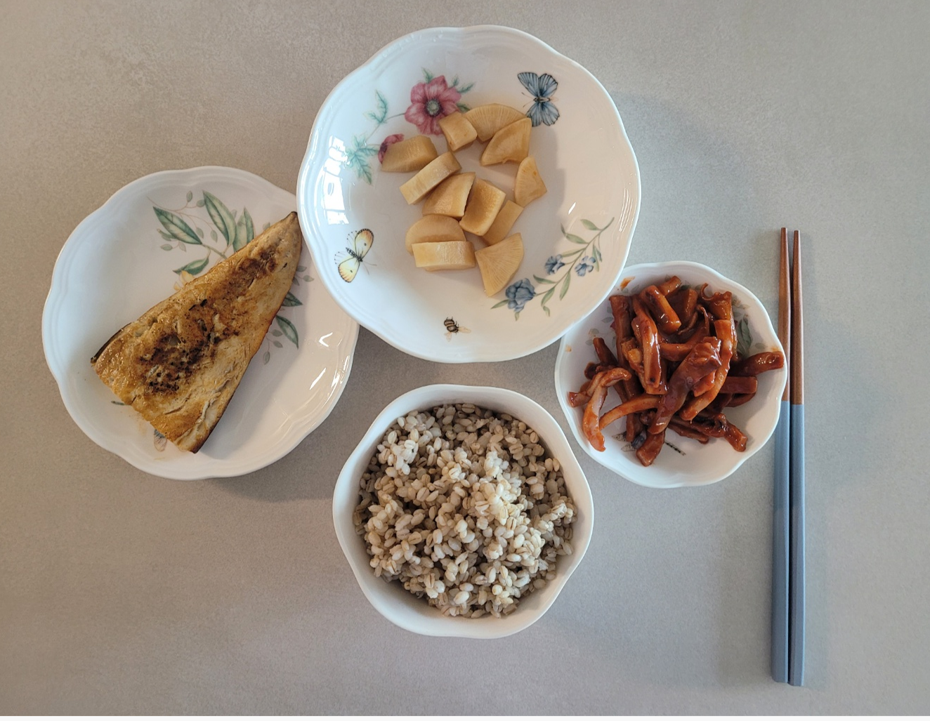 깡보리밥에 무우절임과 생선 한토막 구이가 부식으로 올라갔고 가장 오른쪽 오징어는 사실 오징어무침이다.