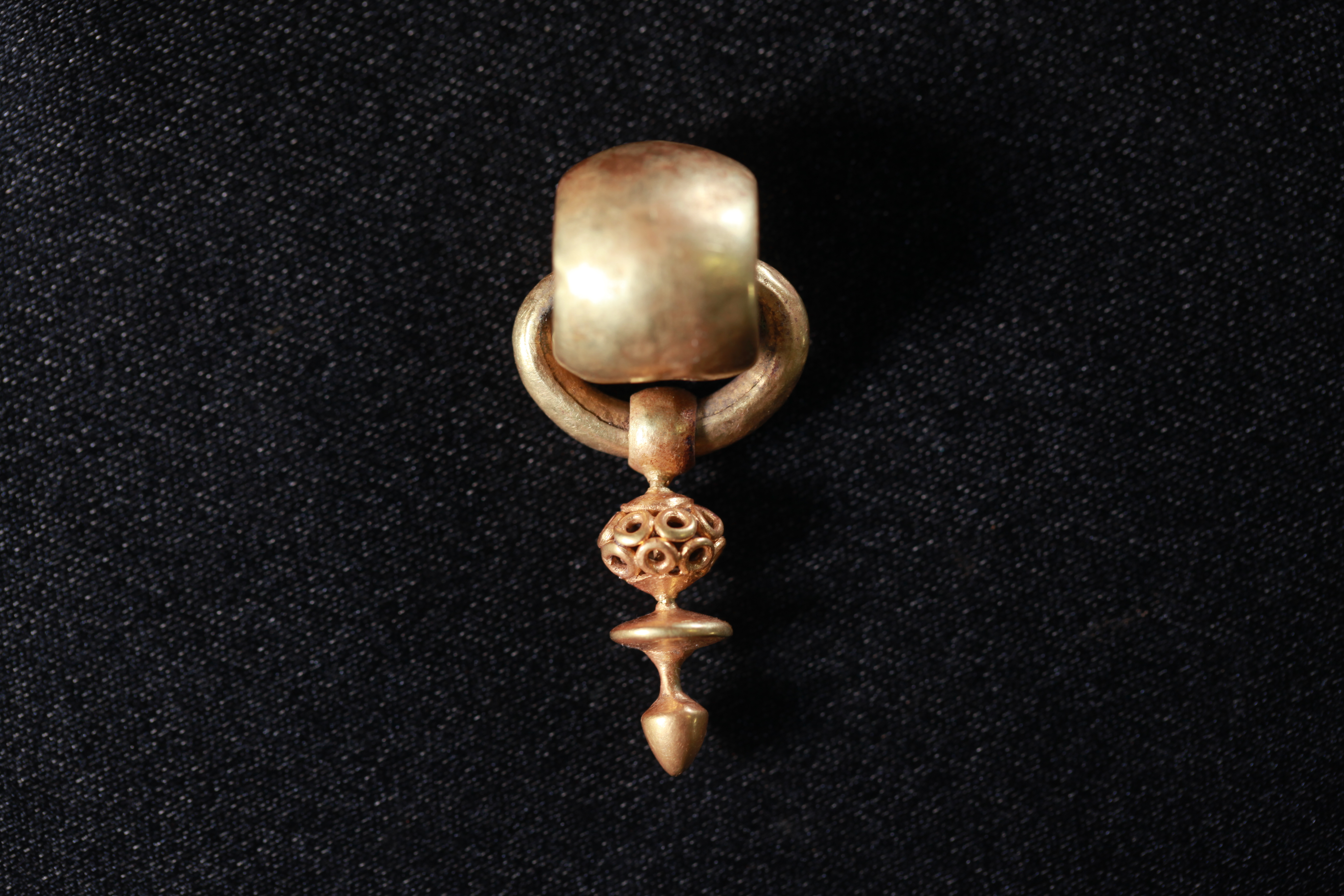 귀고리는 묘광 북쪽에서 출토됐다. 중심고리(主環)와 노는고리(遊環), 연결고리, 구체(球體·샛장식이라고도 하며 중간식<中間飾>이라고도 한다), 원판 모양 장식(圓板形裝飾), 추 모양 장식(錘形垂下飾)으로 구성됐다.