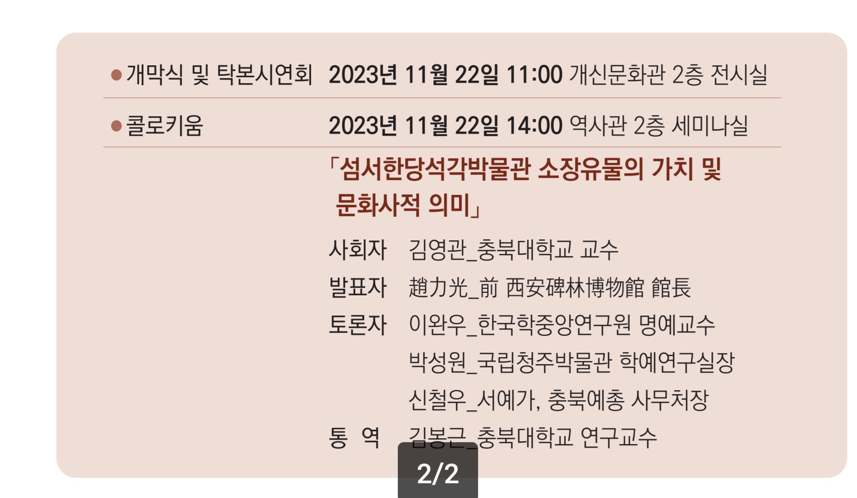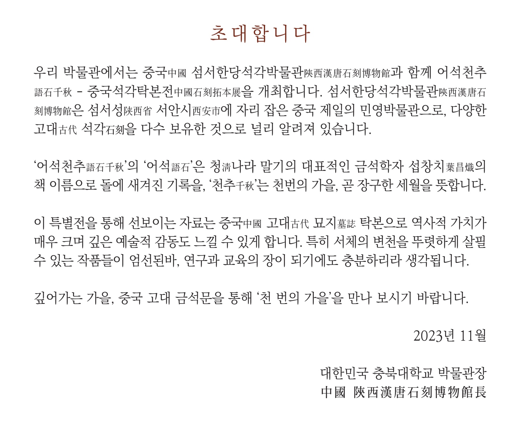 충북대학교박물관이 국립대학육성사업 일환으로 중국 섬서한당석각박물관陝西漢唐石刻博物館과 함께 중국 석각石覺 탁본전 어석춘추語石春秋를 오는 22일부터 연말까지 이 대학 개신문화관 2층 전시실에서 연다는 소식을 전한 바 있거니와 그 후속 소식이다.