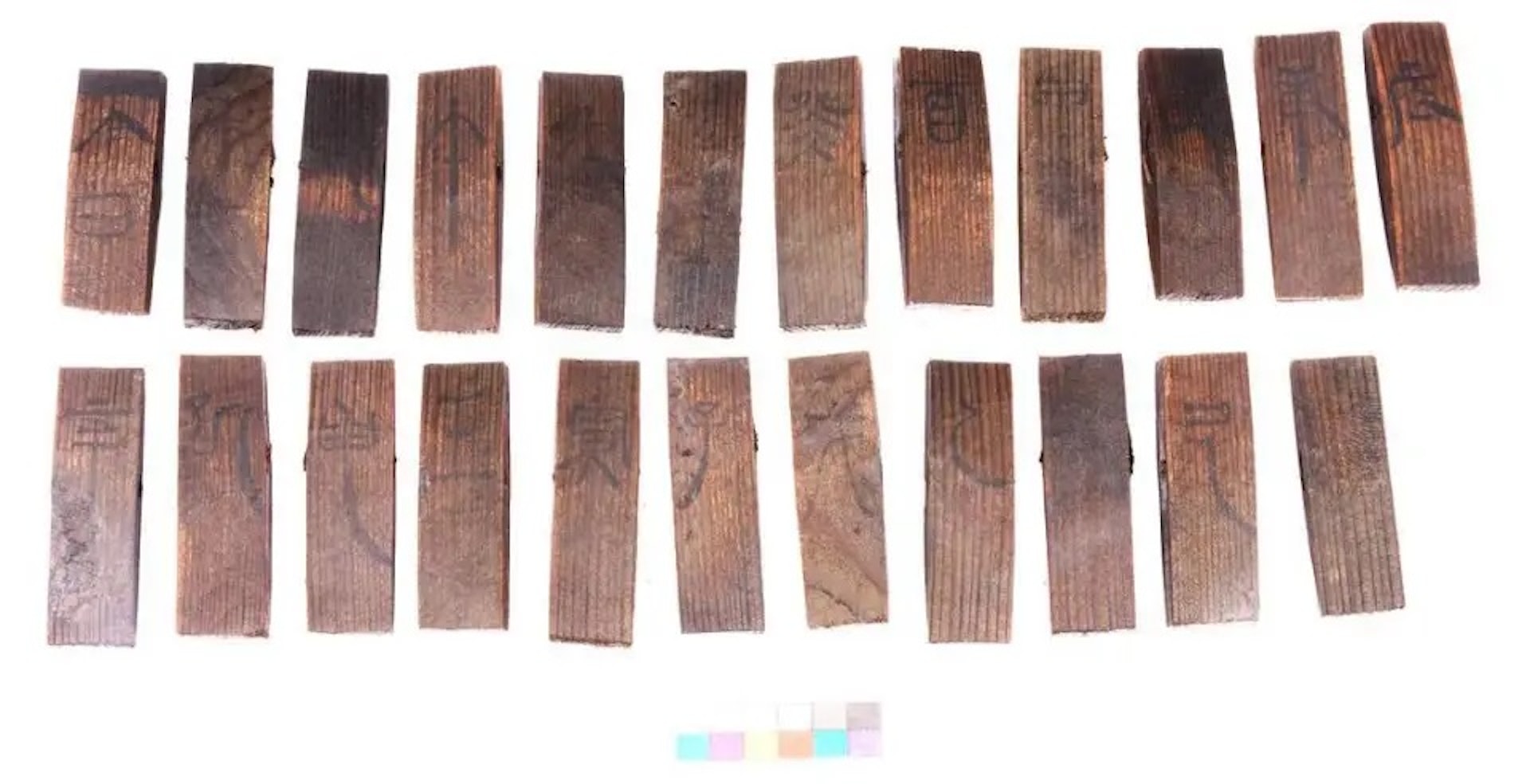 출토 유물 중에는 세트인 이른바 「간지干支」 목독木牘과 1점 목선木船 모형이 있다. 목독 중 23매는 이른바 간지 목독干支木牘으로, 개중 「금일今日」이라는 글자를 묵서한 1점을 제외한 22매에는 모두 한 글자씩 10천간天干과 12지지地支에 해당하는 글자를 썼다.
