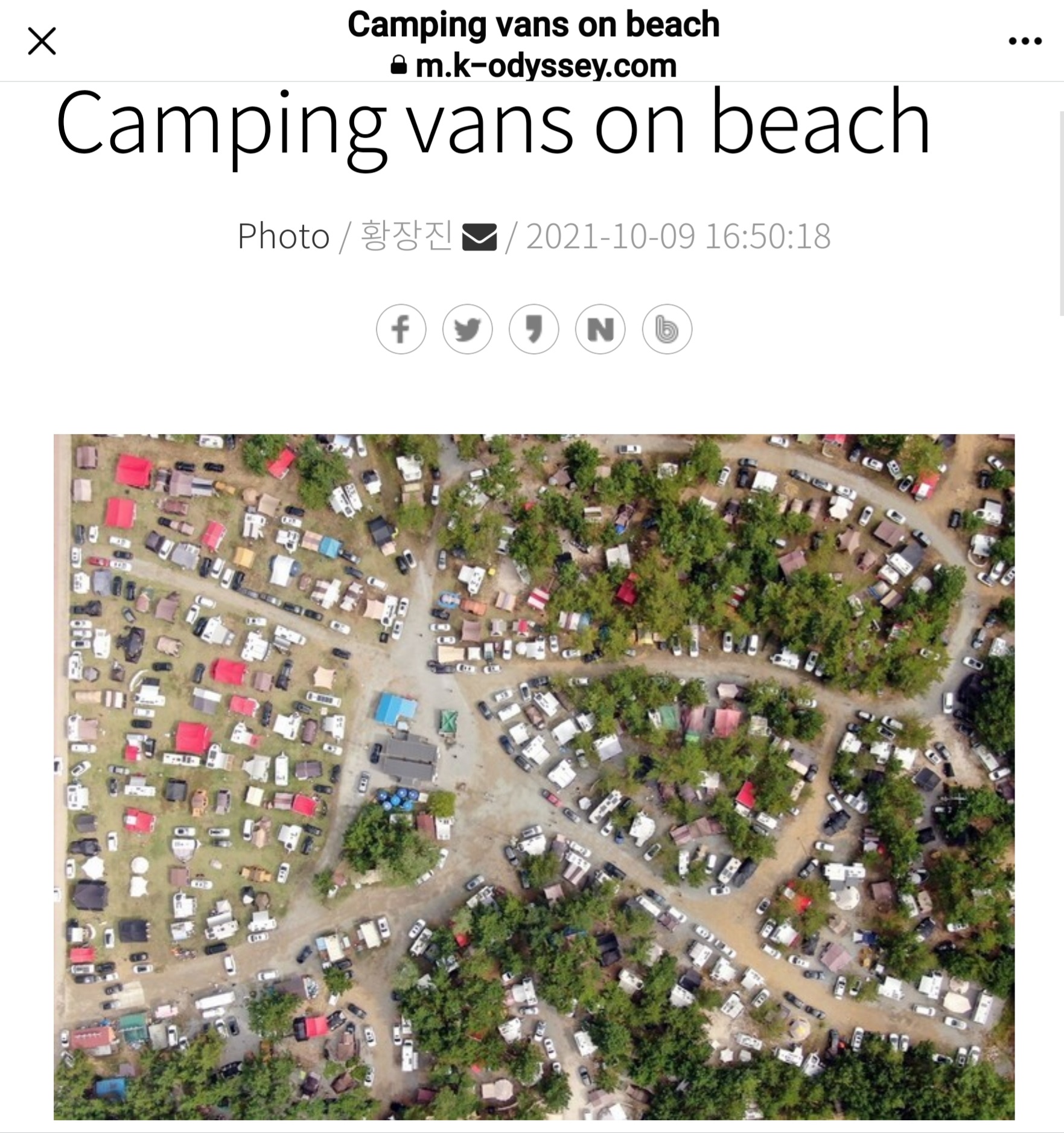 This photo, provided by a reader, shows the auto camping ground on Mongsanpo Beach in the western county of Taean filled with camping vans on Oct. 9, 2021, the first day of a three-day prolonged weekend that lasts until Oct. 11. (PHOTO NOT FOR SALE) (Yonhap)