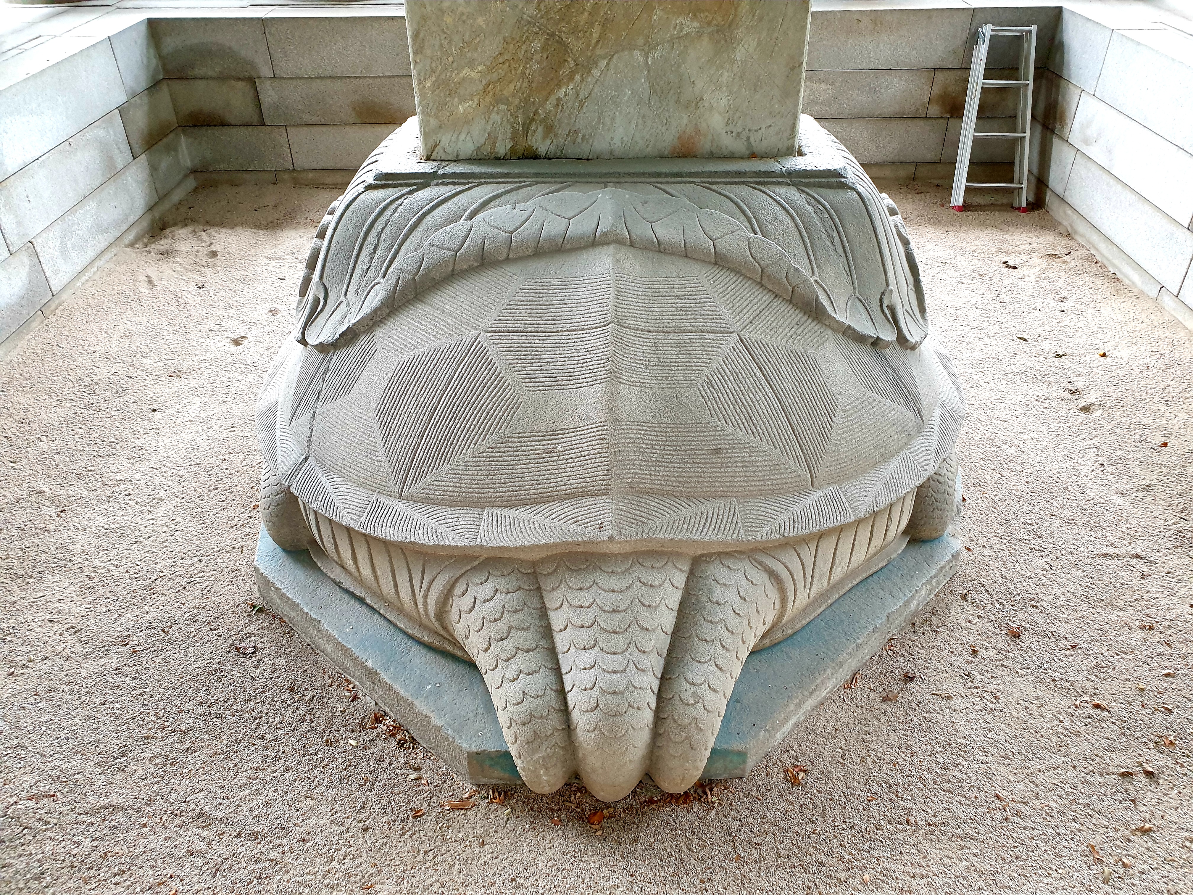 The height of the monument is 494 cm. The turtle was made of granite, and the body stone and head stone were made of marble.