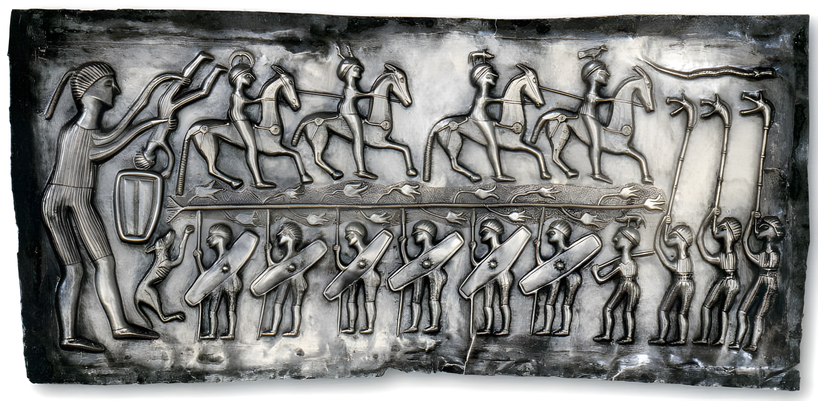 아래로는 켈트족임이 분명해 보이는데 개중에서도 보병이 일렬을 이루어 왼쪽 인물을 행해 전진한다.