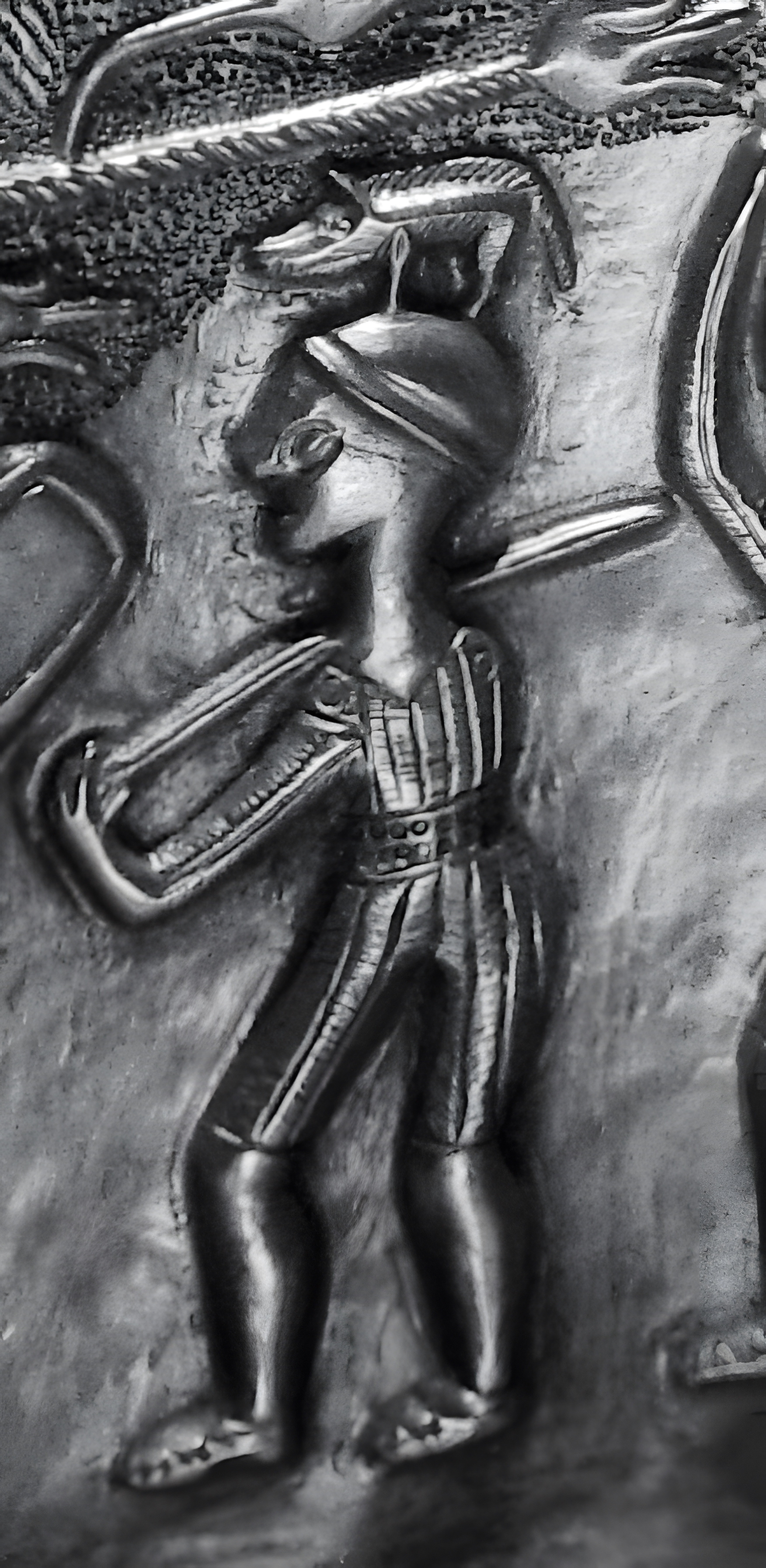 보병렬 뒤로는 꼭대기에 멧돼지 한 마리가 앉은 헬멧을 쓴 전사 1명과 다시 그 뒤로 이상한 장대 비스무리한 것들을 각기 든 세 명이 보이는데 이를 카르닉스 선수들 carnyx players이라는 해설이 보인다.