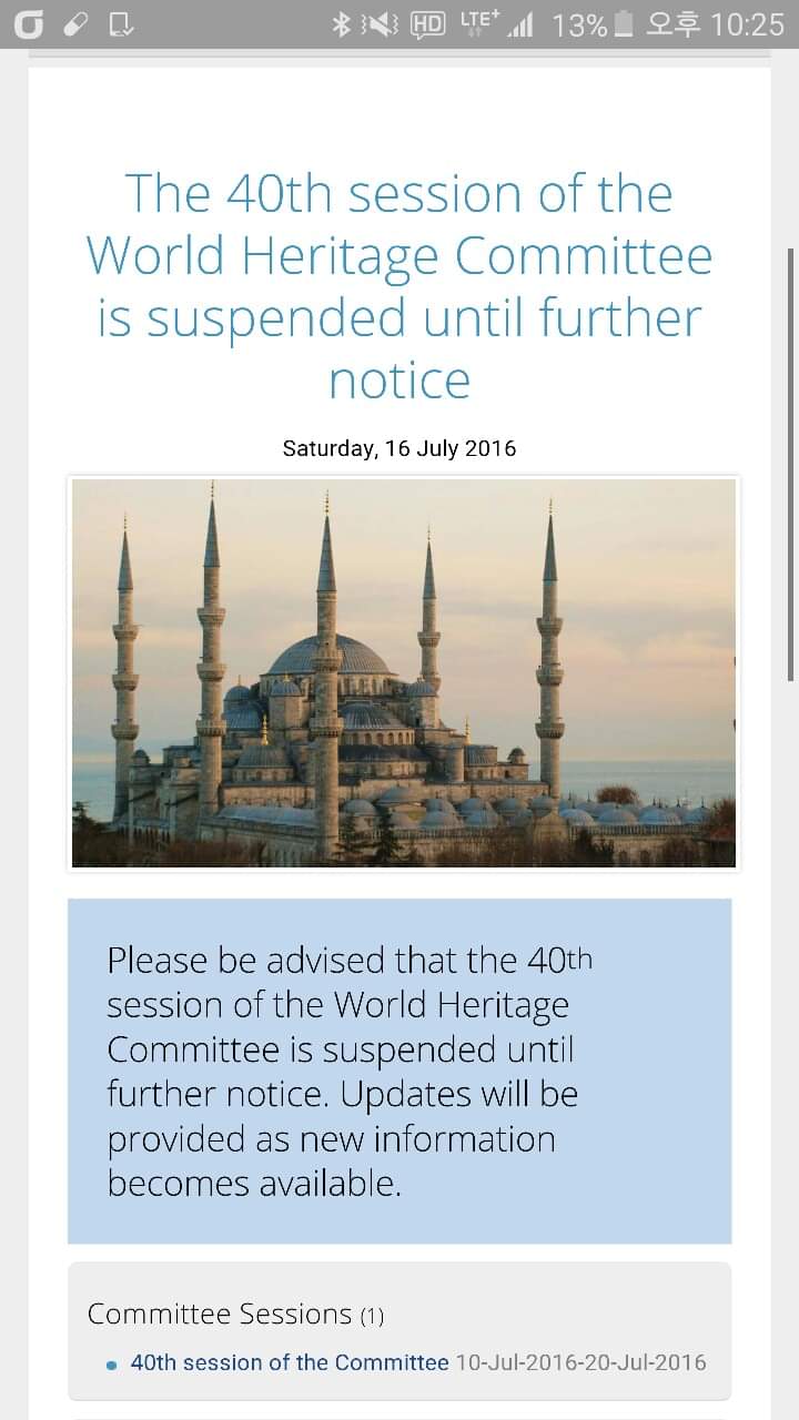 쿠데타가 발발할 그날 하필 이스탄불에서는 제40차 유네스코 세계유산위원회가 열리는 중이었으니, 그와 관련한 소식도 나는 같은 날 다음과 같이 관련 캡쳐와 함께 전했다.