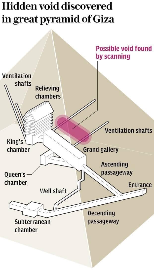 과거 페이스북을 통해 한 번 설명 드린 적이 있습니다만, 2016-2017년 ‘스캔 피라미드'(ScanPyramids)라는 이름의 국제 탐사 프로젝트 팀이 ‘뮤온’(muon)이라는 우주선(宇宙線: cosmic ray) 소립자를 이용하여 고왕국시대 제4 왕조 쿠푸(Khufu: 기원전 2589-2566년) 왕 大피라미드(Great Pyramid) 내부를 스캔한 결과, 지금까지 알려지지 않은 빈 공간 존재를 확인했다고 보고한 바 있습니다.
