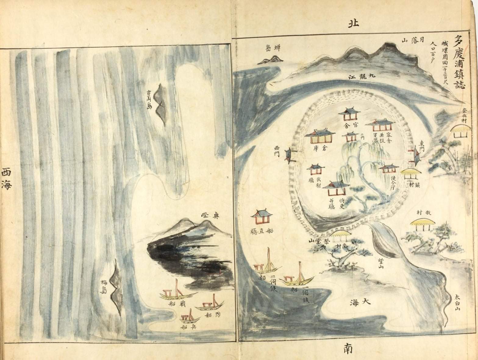 성곽 바깥, 바다에 임한 데에는 선직청船直廳이 보이는데, 선박 관리 담당을 했던 곳이 아닌가 한다. 이에서 관리했을 선박 종류로는 전선戰船 병선兵船 방선防船 일사후선一伺候船 이사후선二伺候船이 있어, 이 중에서 일사후선 이사후선은 사후선이 두 척임을 표시한 것이 아닌가 한다. 명칭으로 보아 척후 담당이다.