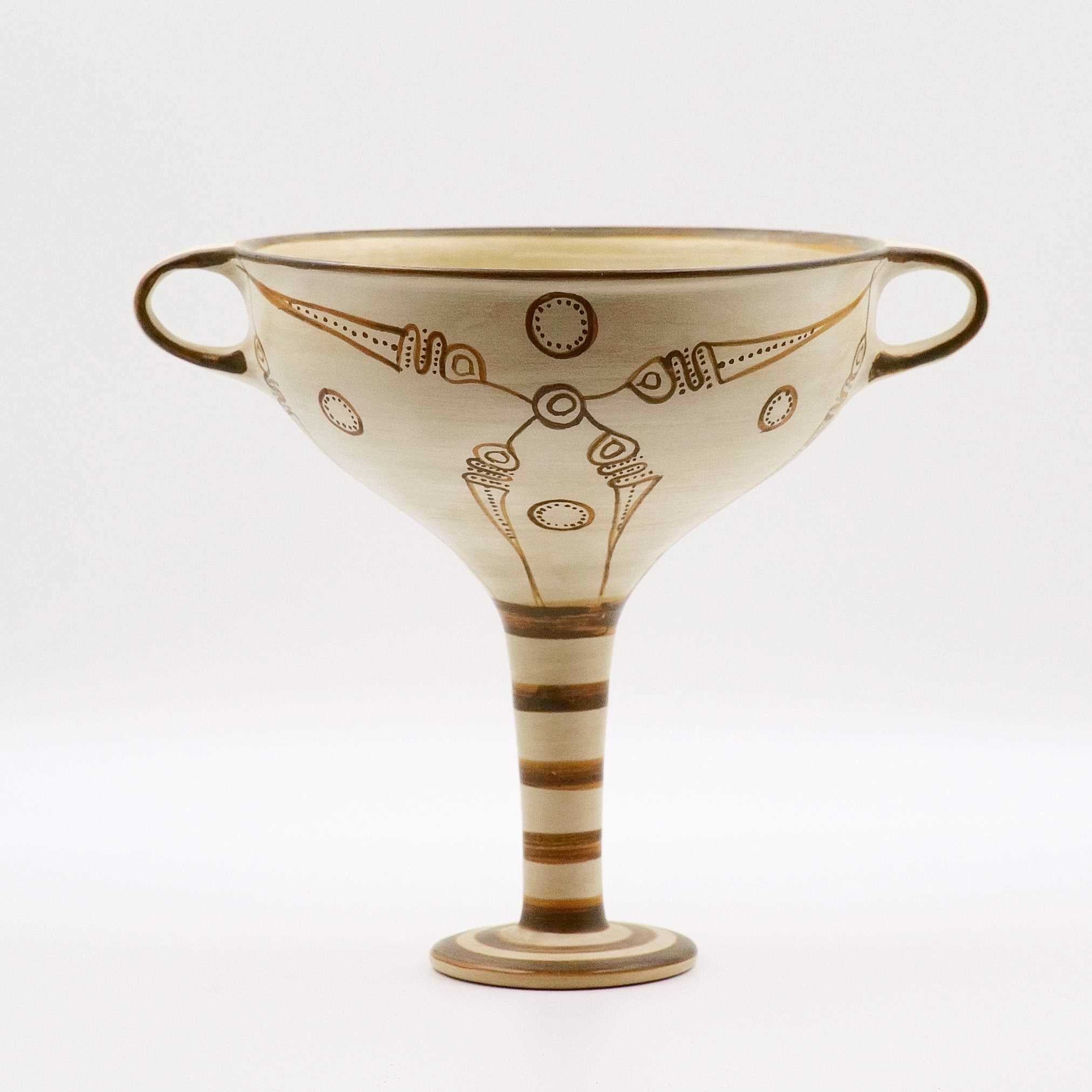 the most common type of cup in the period, usually associated with the drinking of wine. The cup often consists of a rounded base and a thin stem under a basin. The cup is accompanied by two handles on opposite sides.