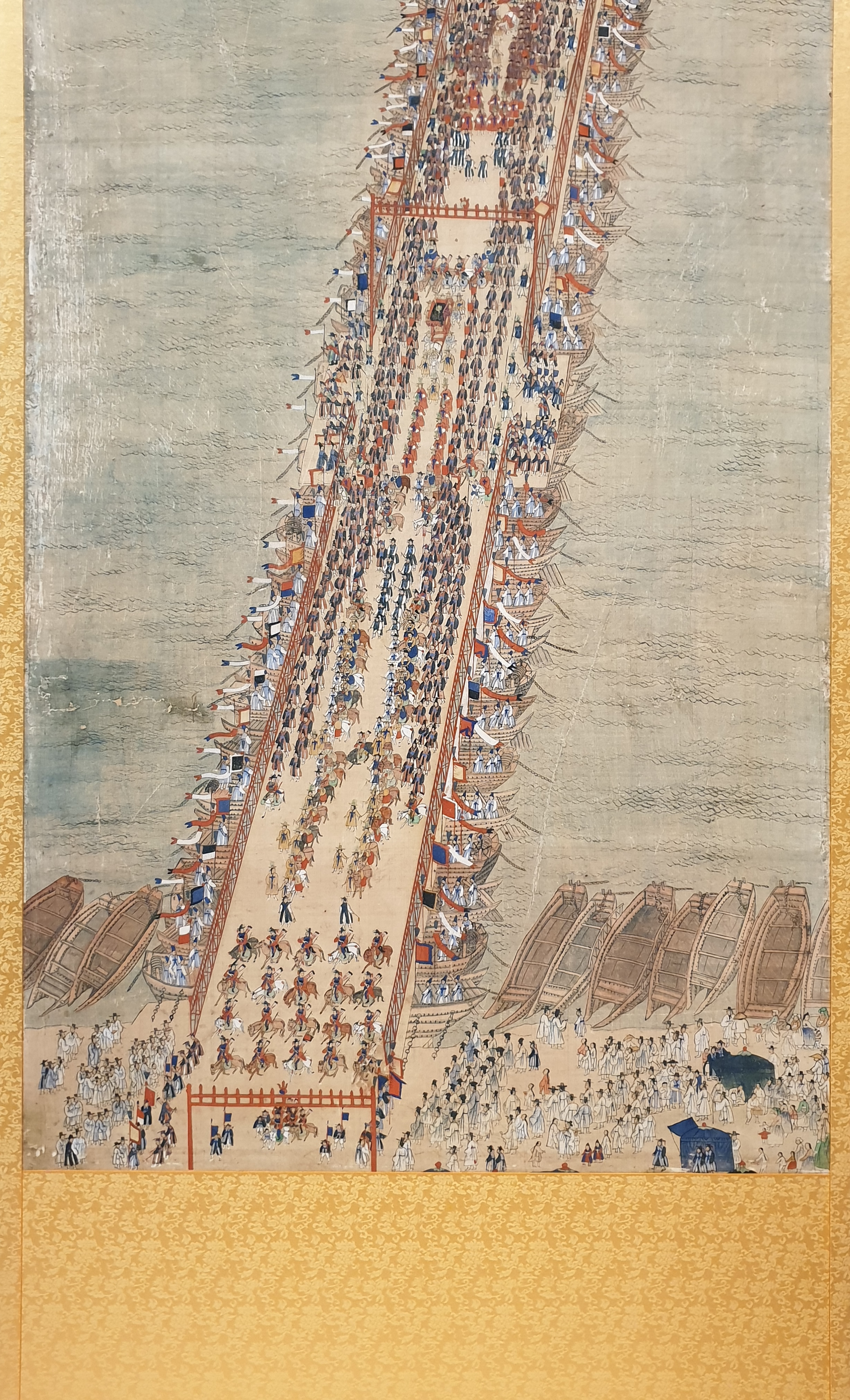 1795년(정조 19), 조선 임금 정조가 지금의 수원 화성에 행차하는 모습을 그림으로 정리한 華城行幸圖화성행행도 팔폭 병풍 중 한강주교환어도漢江舟橋還御圖라는 이름이 붙은 그림이다.