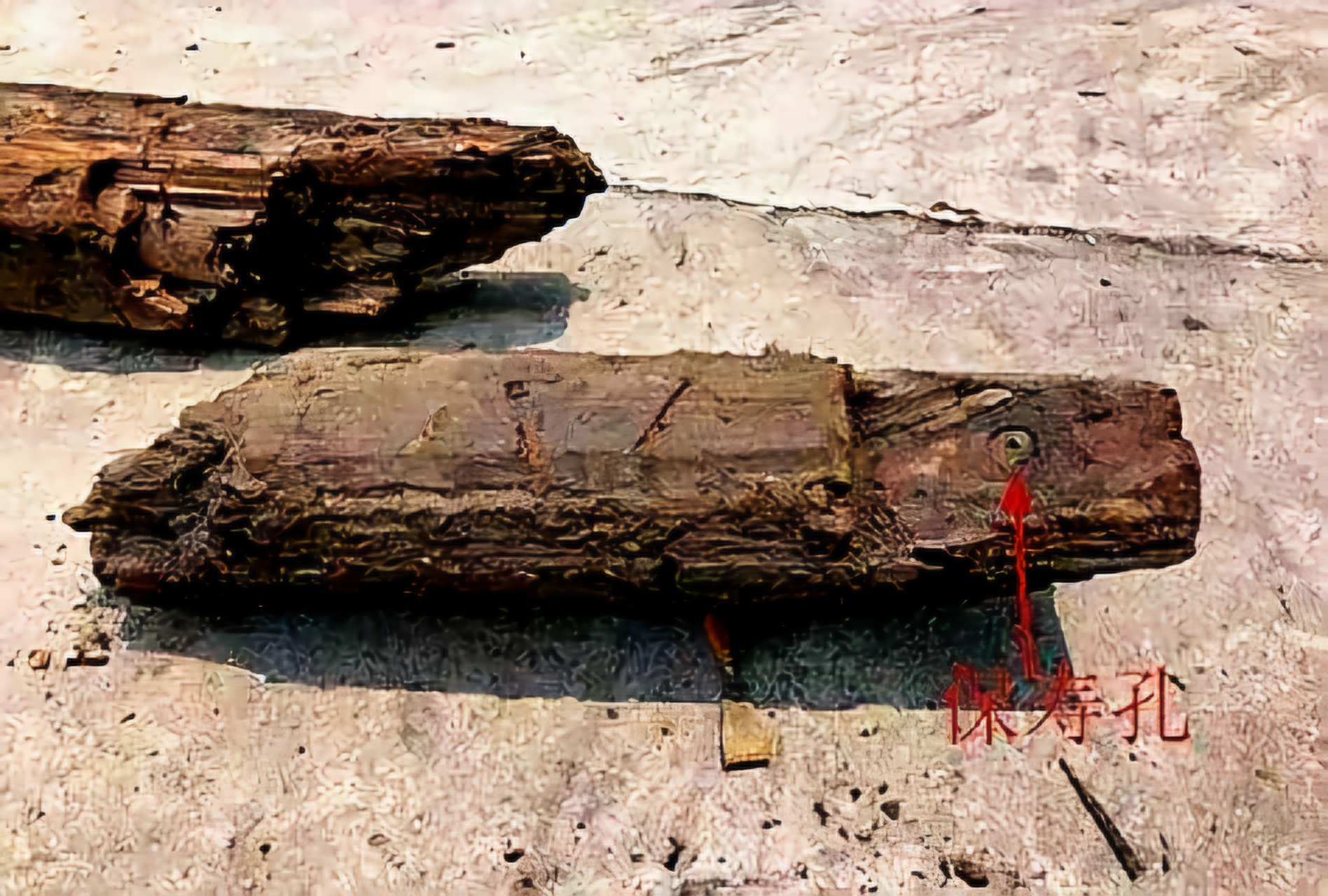 이 고선박 주용골主龙骨과 짧은 수룡골탑首龙骨搭 접점에 원형 구멍을 뚫었으니 이를 속칭 “보수공保寿孔”이라 하는데 그 안에 홍색 베로 감싼 2개 북송시대 동전 “대관통보大观通宝”를 넣었다.