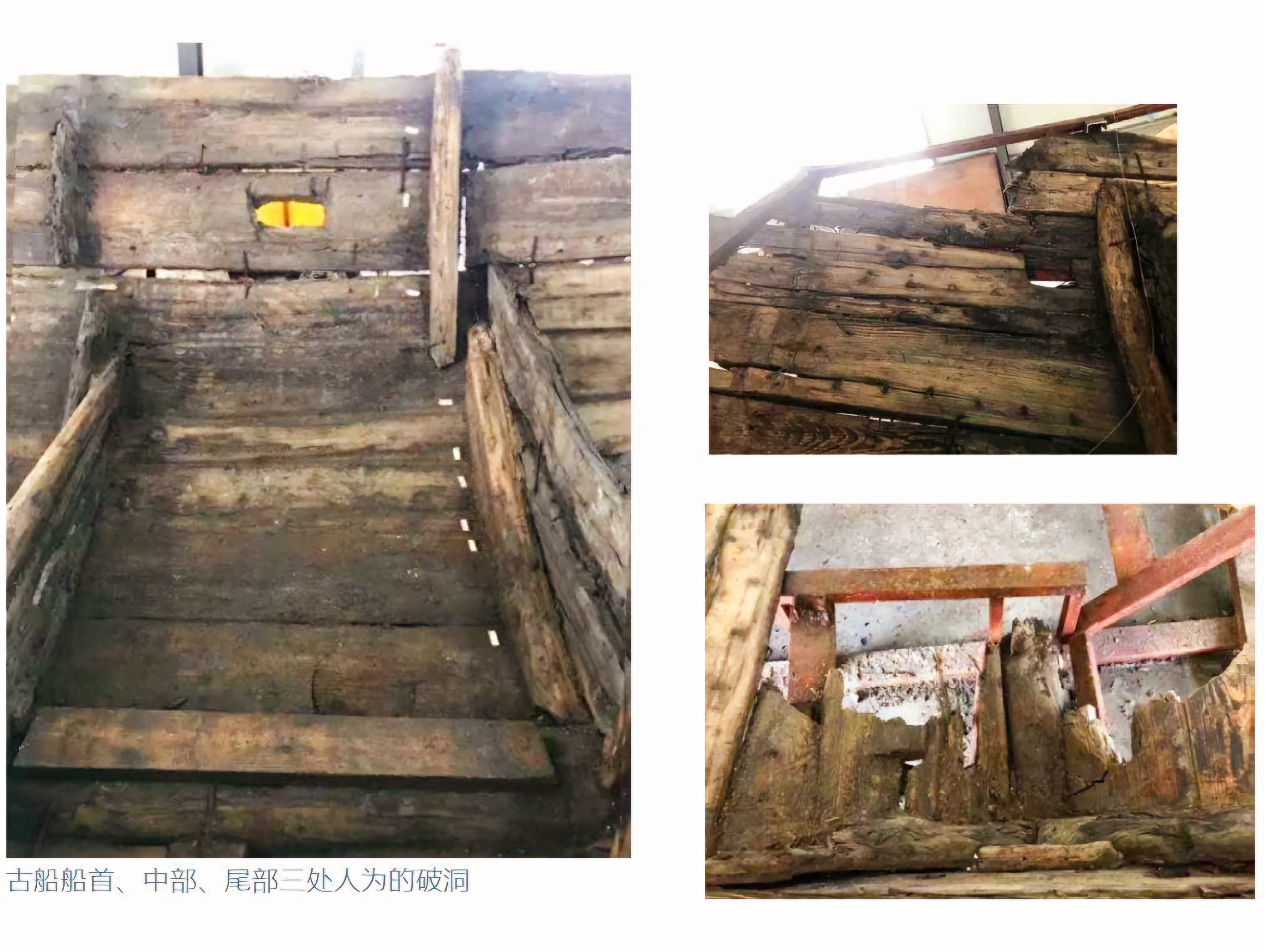 이 고선박 선수船艏·중부中部·미부艉部 세 곳에는 인위적인 파동破洞이 있고 그 구멍에서는 날카로운 도구로 판 흔적이 있으며 안은 크고 밖은 작아 이 선박이 인위로 파괴되어 침몰했음을 보여준다.