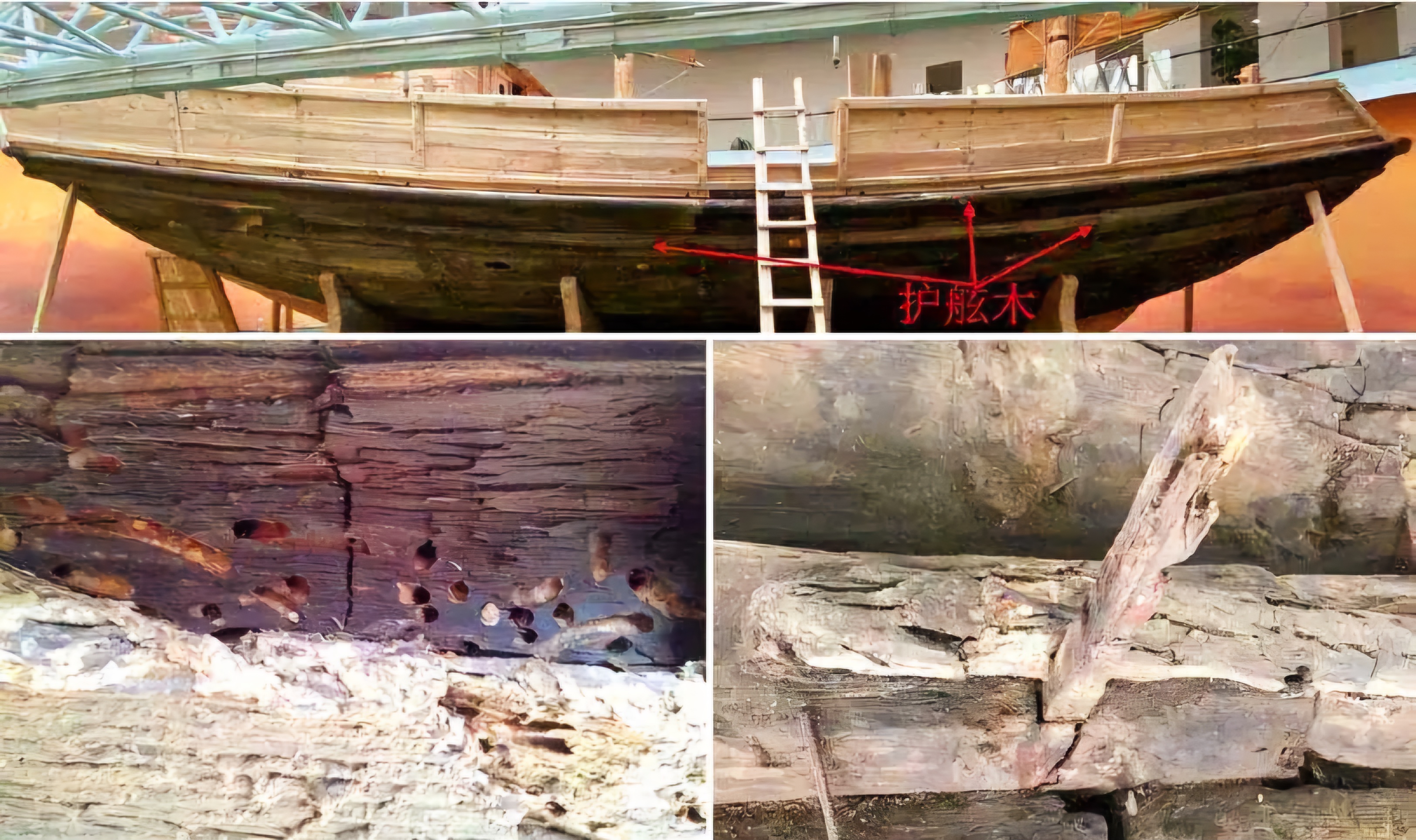 고선은 두 갈래 호현목护舷木을 설치하고 목판木板 여러 군데에서는 해충이 갉아 먹어 생긴 도동盗洞이 있다.