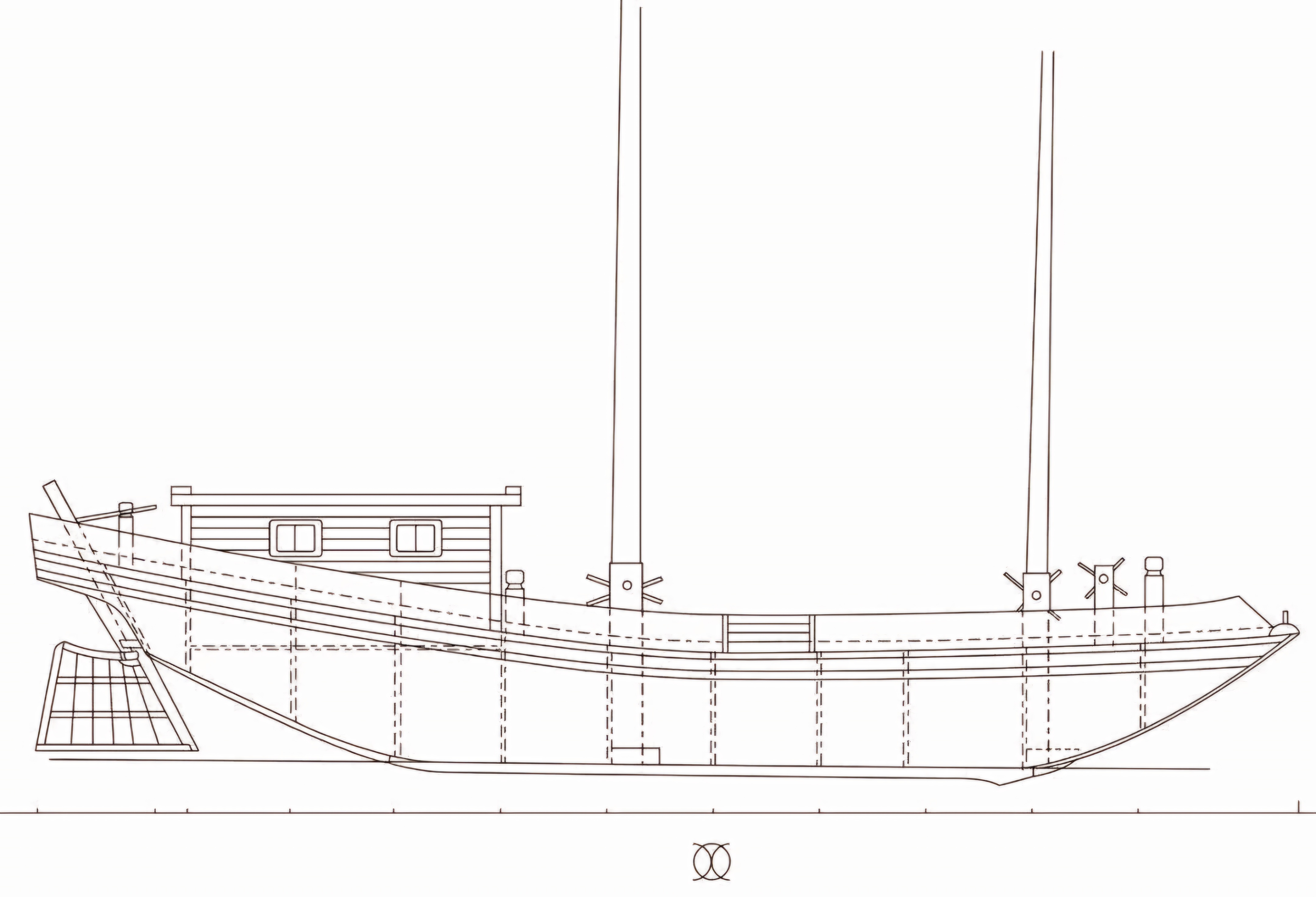 평면은 대략 柳叶形[willow leaf shape]이며 앞은 횡단면 “V”자형이고 후단 횡단면은 “U”자 형이며, 도합 11개 격창隔舱에 쌍돛대[双桅]다.