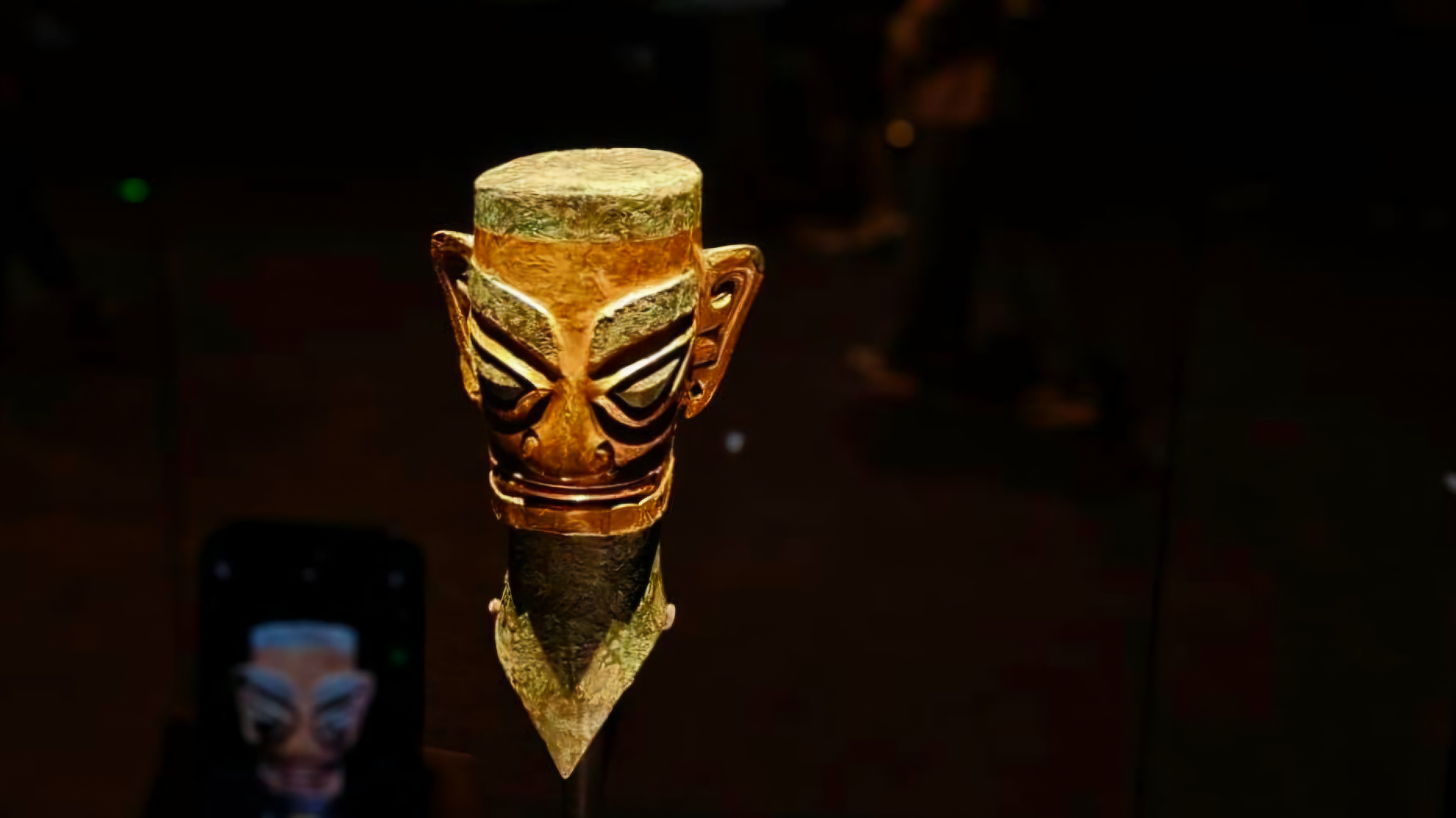 중국 쓰촨성 광한시 삼성퇴유적(기원전 1600 ~ 1200)의 황금가면과 금박으로 장식한 청동인물상.