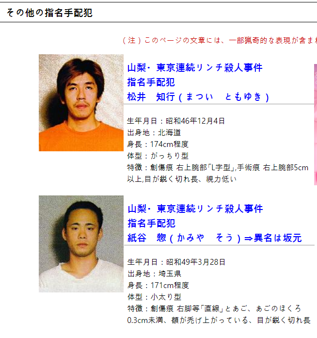 紙谷은 다른 용의자 마쓰이에 대해 "어디서 무엇을 하는지 모른다"고 진술하고 있다고 한다. 마쓰이는 2003년 5월 도쿄도 신주쿠 구에서 스낵코너를 경영했던 남성 (당시 38세)이 사망한 상해 치사사건에 대해도 국제 수배 중이었다.