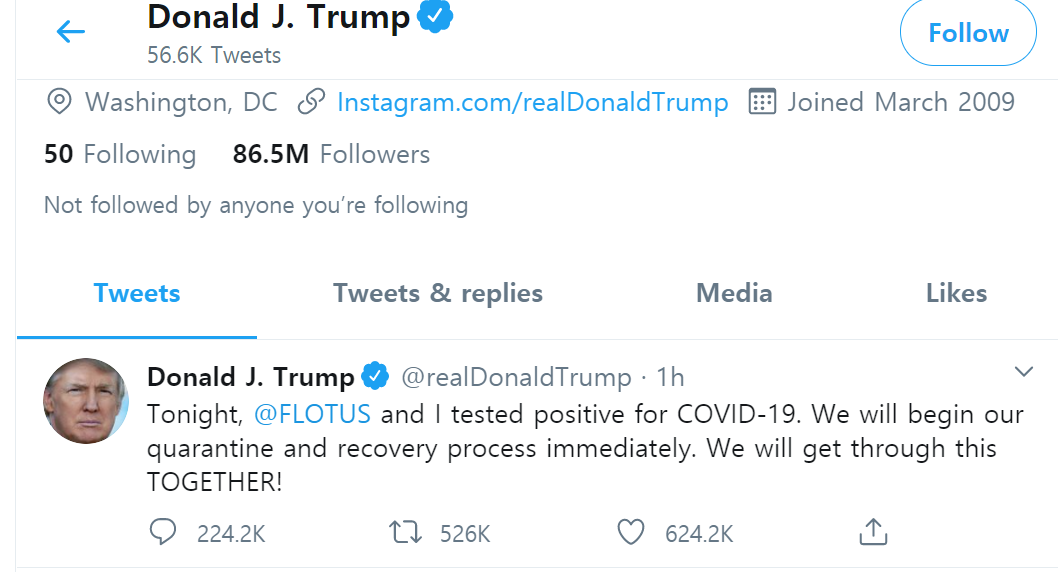 Tonight, @FLOTUS and I tested positive for COVID-19. We will begin our quarantine and recovery process immediately. We will get through this TOGETHER!