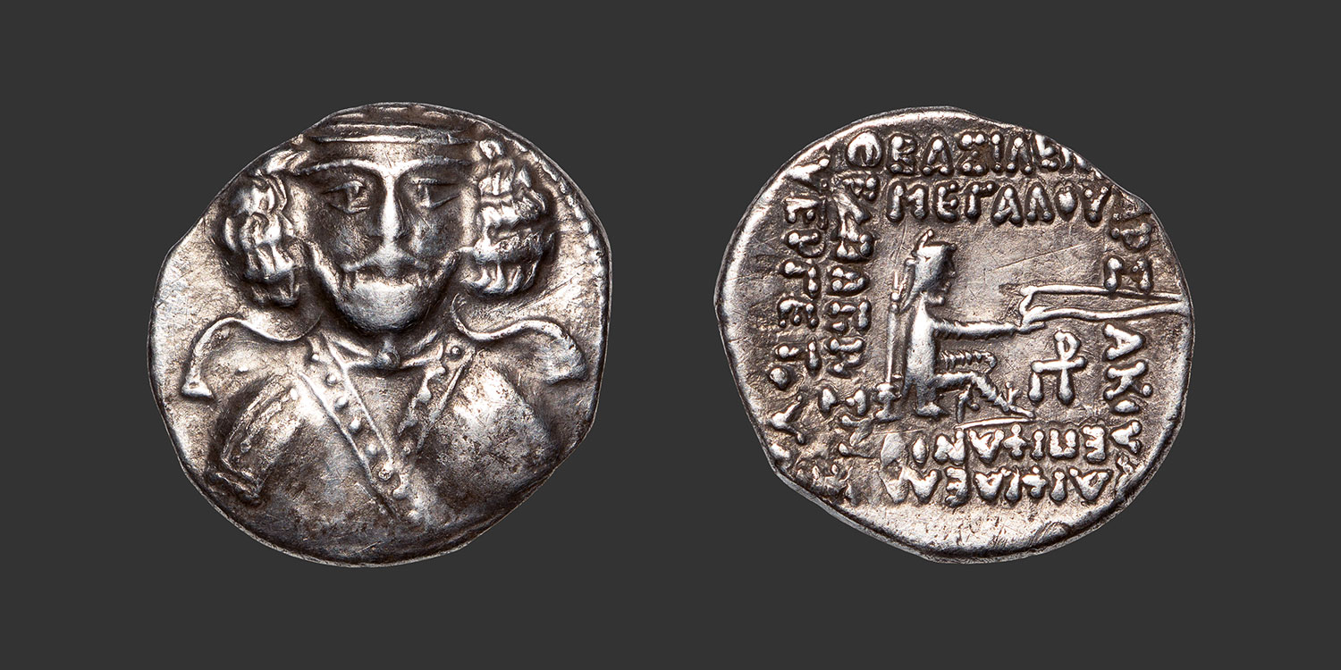 파르티아 Parthia 제국 아르사케스 왕조 프라아테스 3세 Phraates III 얼굴을 도안한 은화 앞면과 뒷면이다.