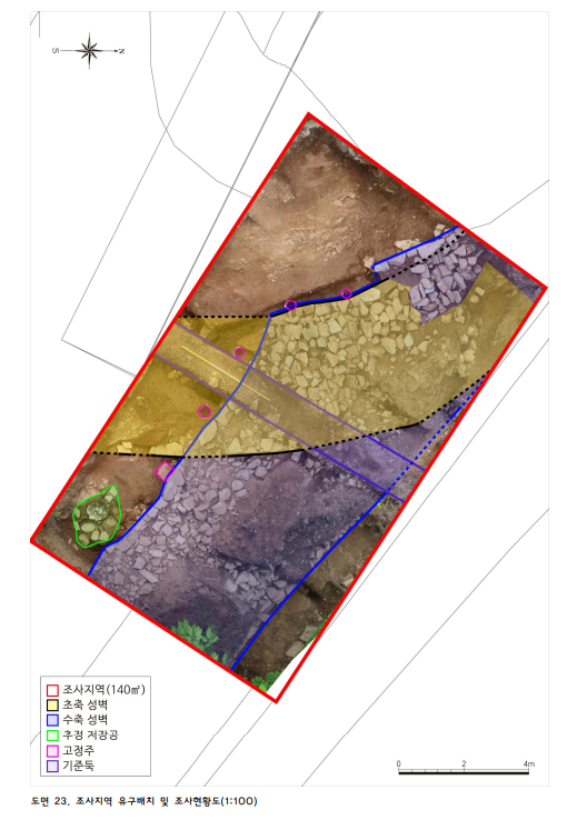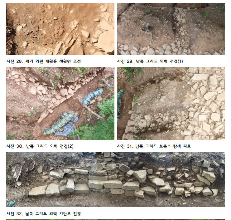 따라서 초축과 수축성벽의 교차부 및 추정 저장공 혹은 제의시설이 확인되고 있는 남쪽 그리드의 동쪽과 남쪽지역을 중심으로 추가적인 발굴조사를 실시하여 성벽의 진행 양상과 구조, 그리고 건물지, 저수지, 저장시설 등 성내 유적을 파악할 필요가 있을 것으로 판단된다.