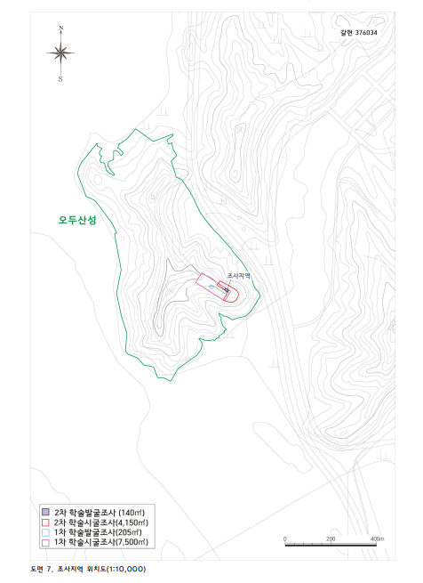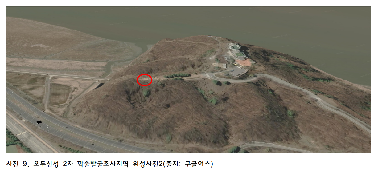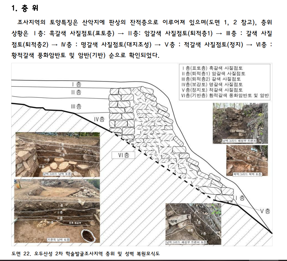 다만, 우리 연구원에서 최근 3년간 실시한 조사를 바탕으로 보면, 오두산성의 성벽구조는 내외성 구조가 아니라 초축과 수축 과정에서 교차하는 성벽이 조성되었을 가능성도 있다.