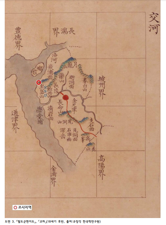교하군(交河郡) 오도성(烏島城)이 있다. 한강과 임진강 하류가 이곳에서 합류된다