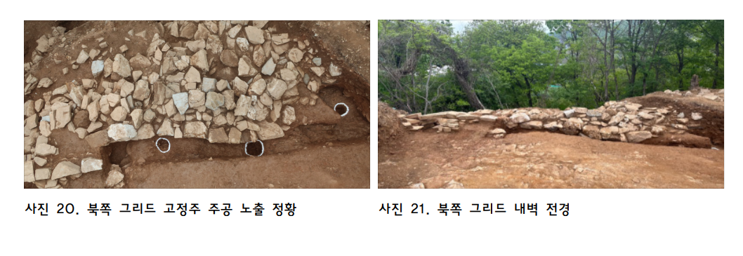 북쪽 그리드 내, 잔존한 수축 성벽의 내벽과 인접하여 2~2.5m 내외의 등 간격으로 고정주(固定柱) 주공 3기가 확인되었다.