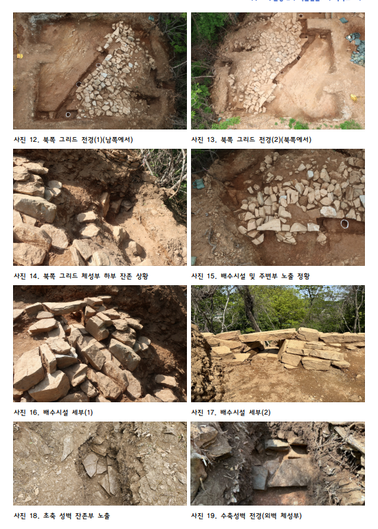 2. 북쪽 그리드에서는 성벽의 체성부 및 배수구를 조사하였다. 배수구는 입수구와 체성부 내부의 벽석과 바닥석 일부만 잔존한 상태였다. 입수구로 연결되는 집수부는 헬기장 등 군시설 조성 과정에서 상당부분이 훼손된 상태로 보인다.