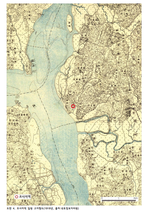 조사지역은 오두산에서 남서쪽으로 뻗어내린 가지능선 중 제일 북동쪽에 자리한 능선의 북쪽 사면에 해당하며, 조사지역 내 해발고도는 80~85m 정도이다.