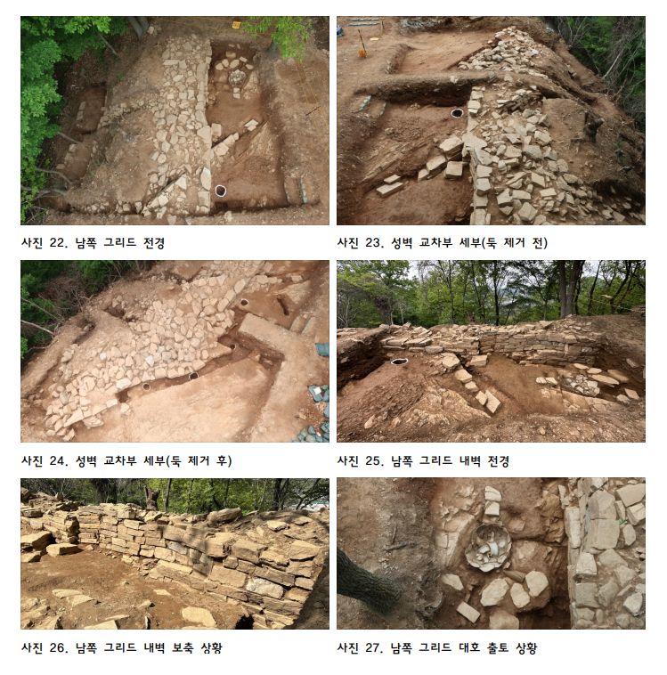 노출된 성벽의 내·외부에서는 초축성벽 상부로 수축하고 보축한 흔적이 잔존한 성벽의 체성부가 남쪽 그리드에서 북쪽 그리드까지 사선으로 이어지고 있었다.