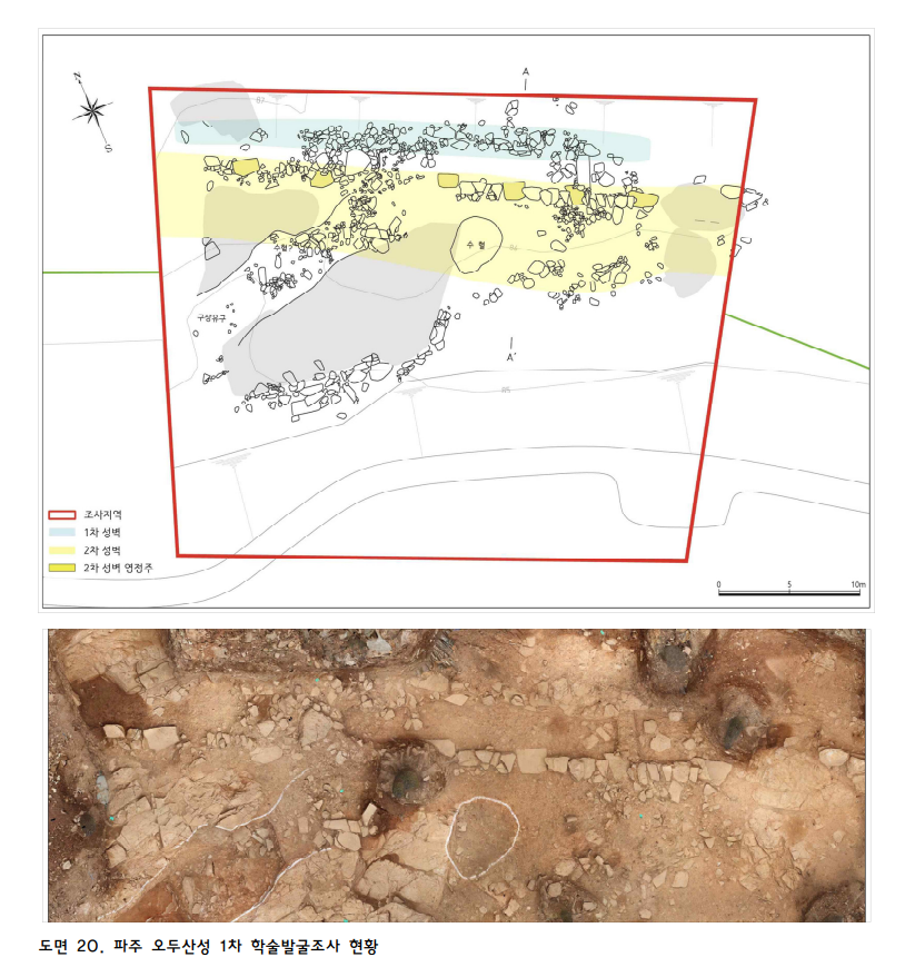 한강과 임진강이 만나는 지점에 위치하는 경기 파주시 오두산성에 대한 두 번째 발굴조사에서 처음 쌓은 성벽과 고친 성벽이 교차하는 양상을 비롯해 성벽과 관련된 배수구 흔적을 확인했다고