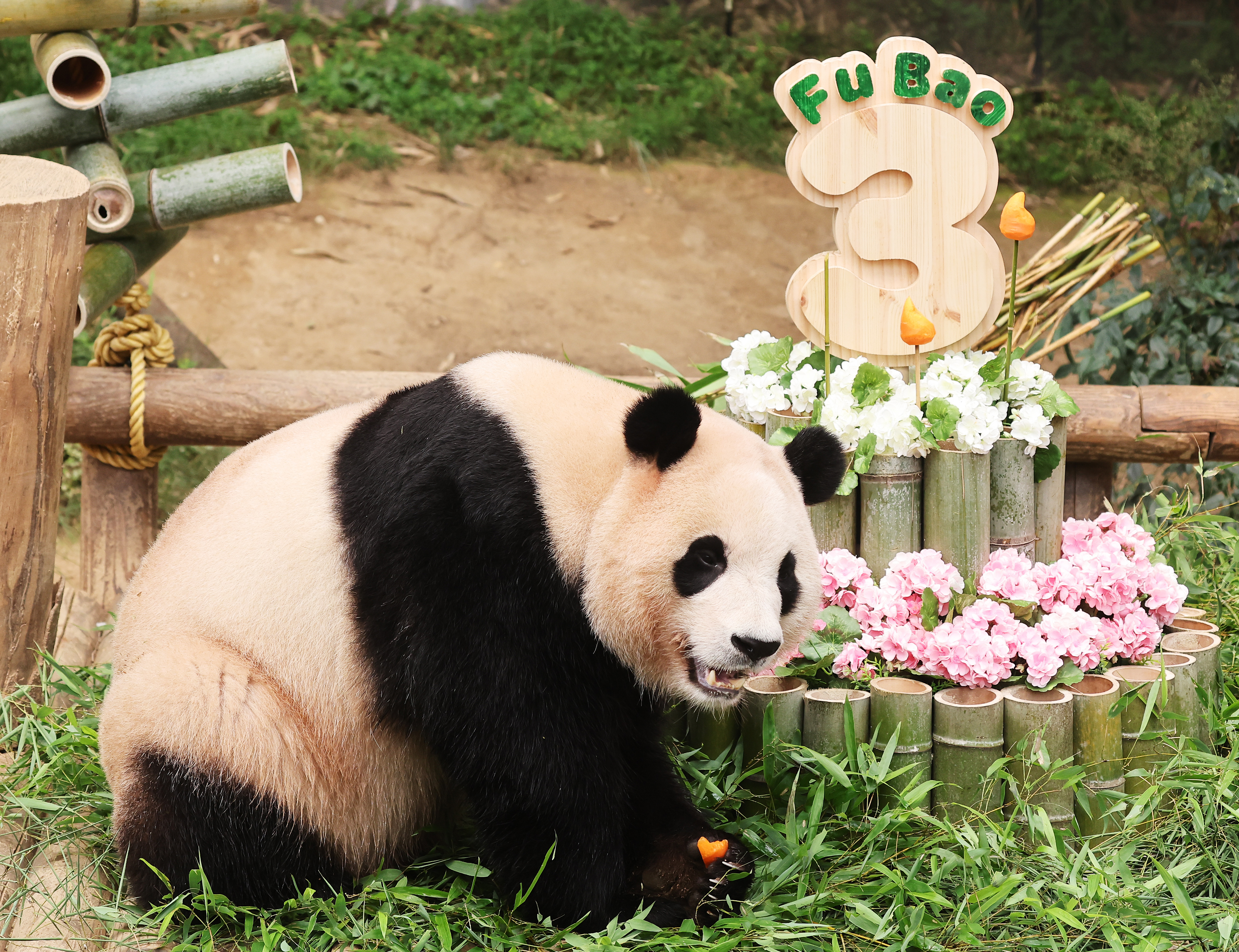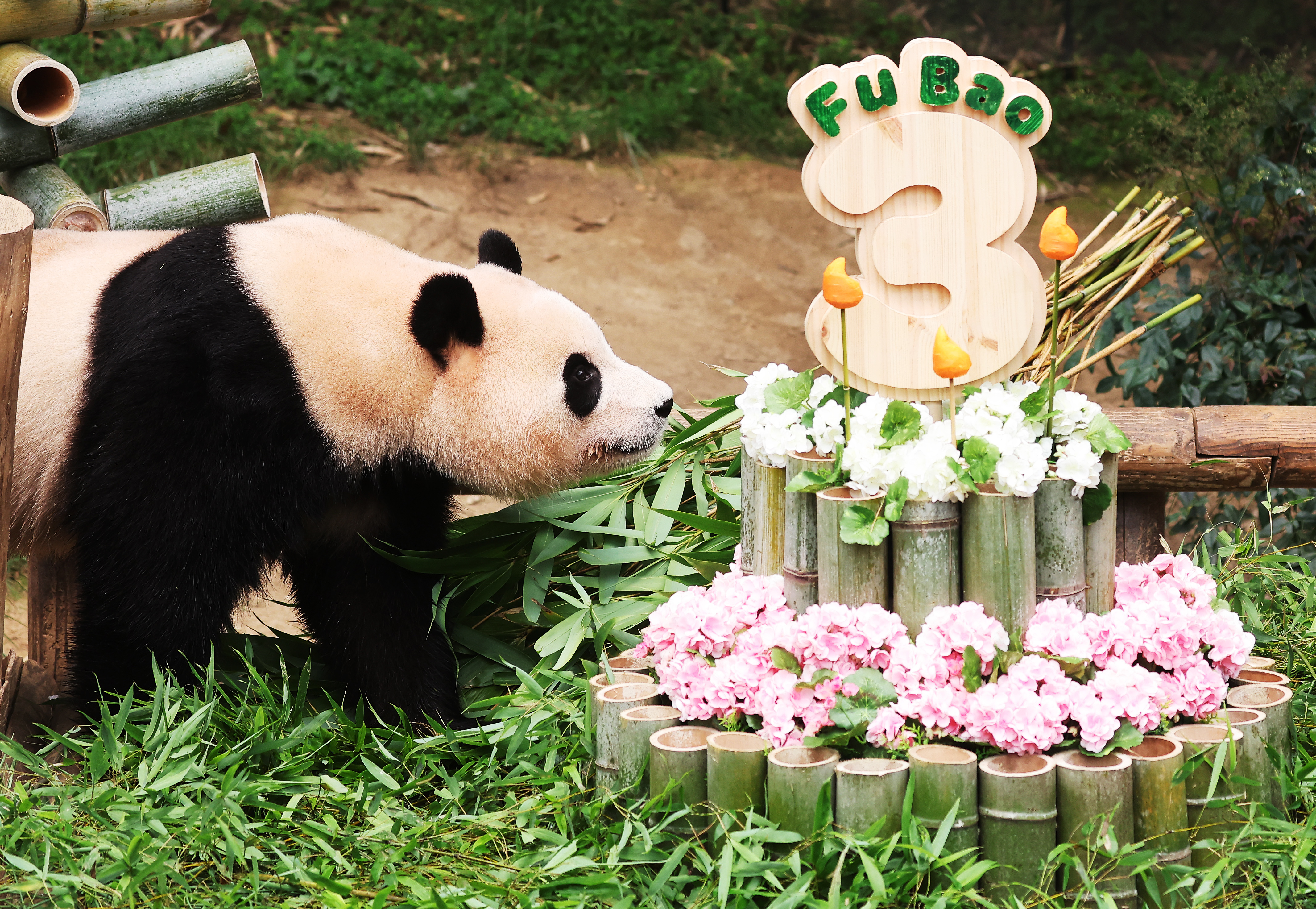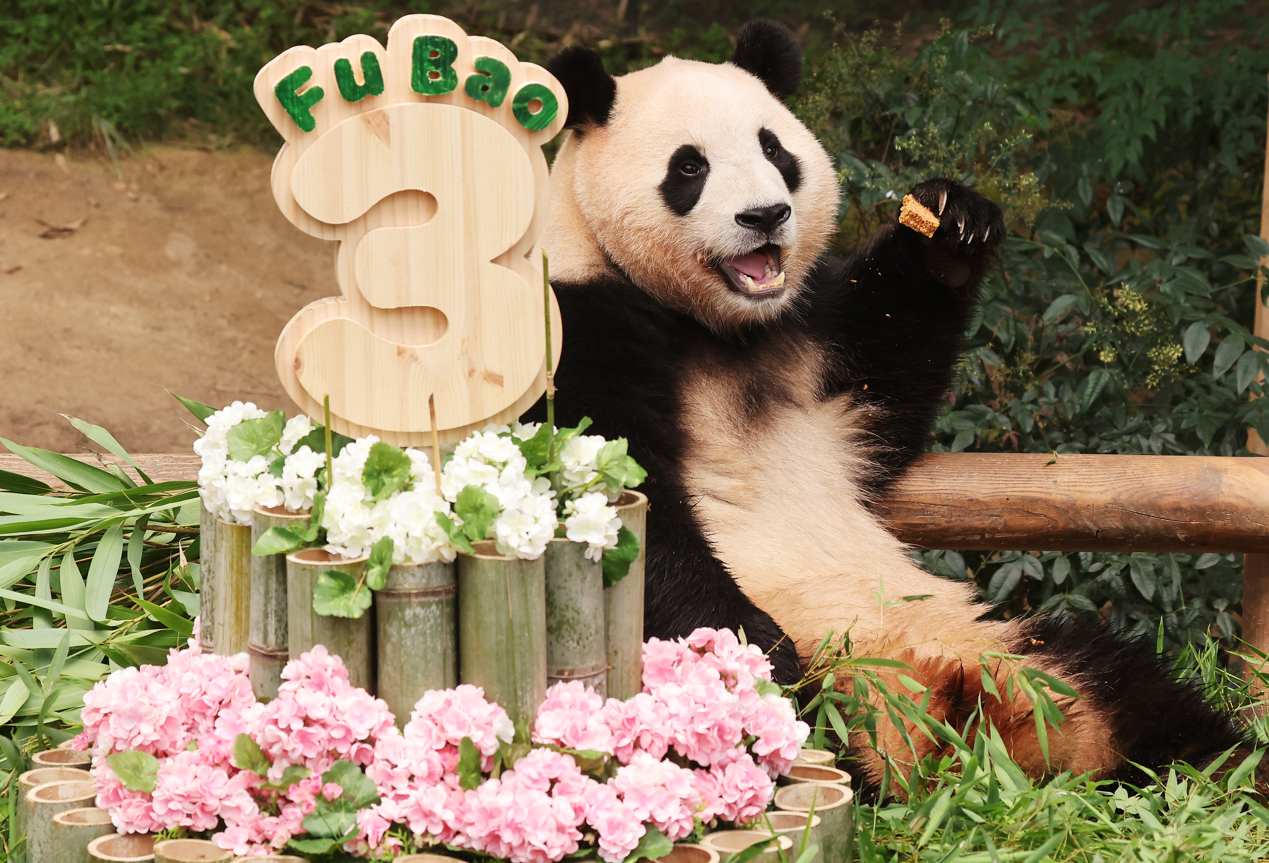 Female panda Fu Bao enjoys a cake prepared by her trainers at Everland in Yongin, 42 km south of Seoul, on her third birthday on July 20, 2023.
