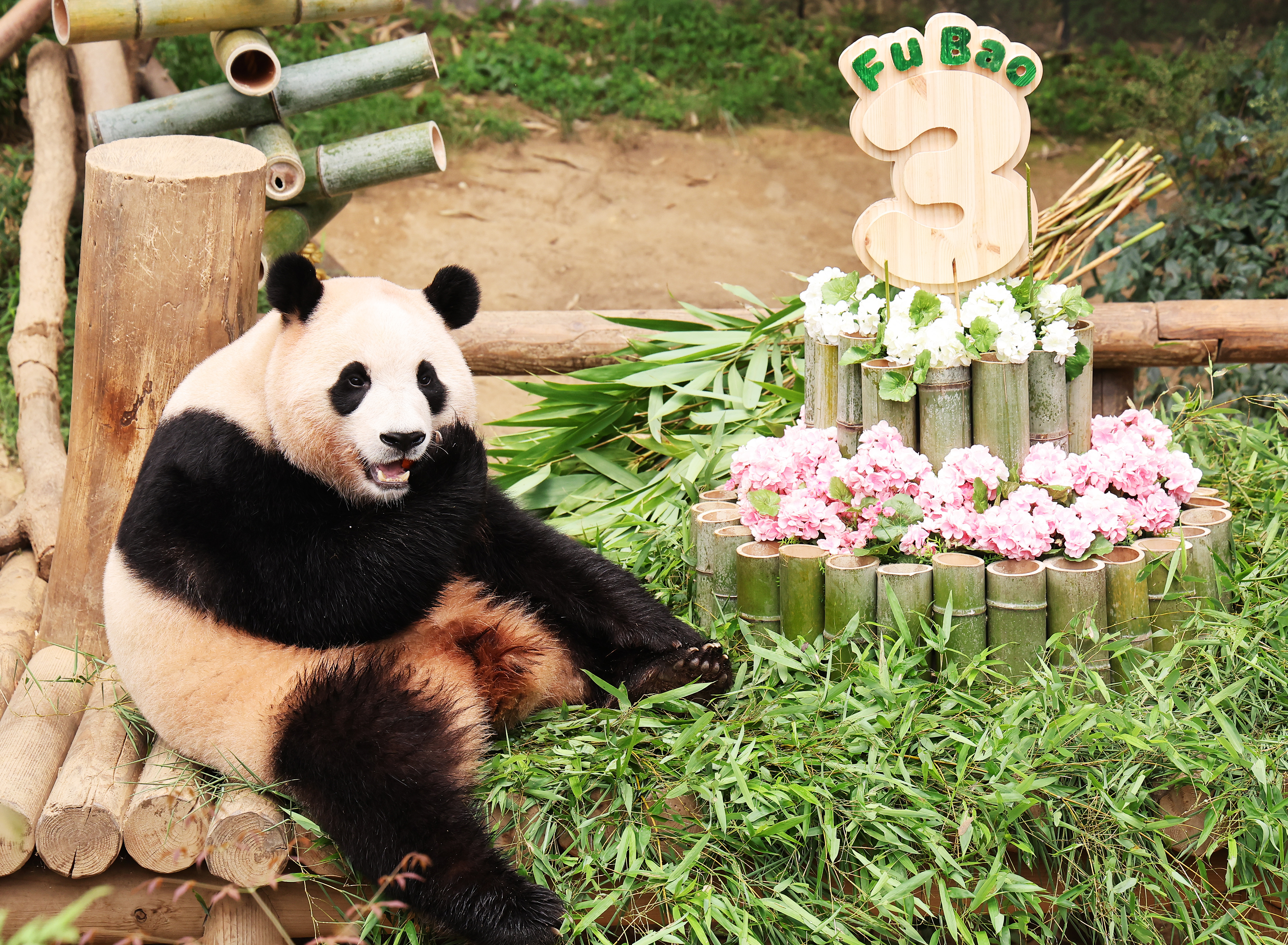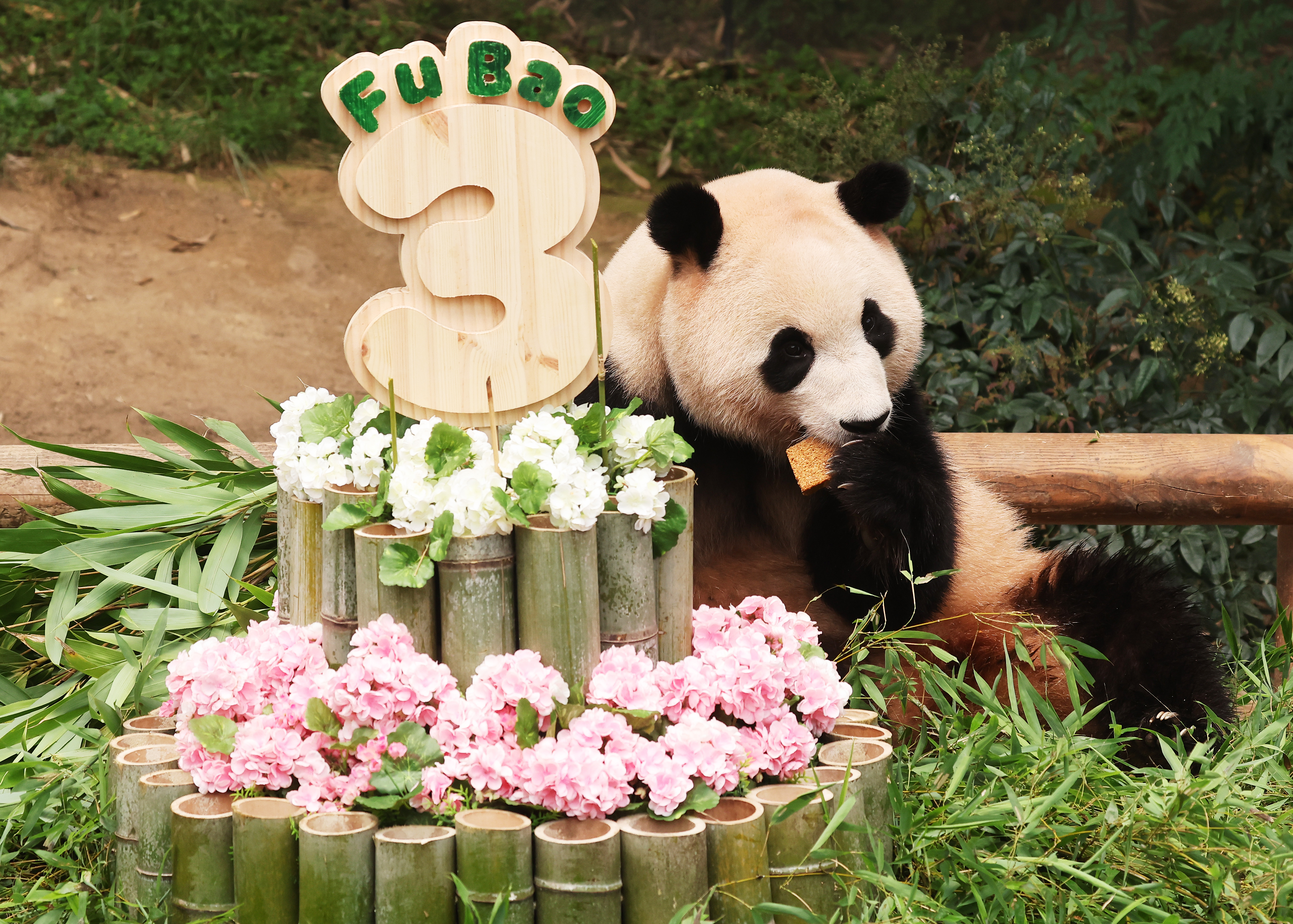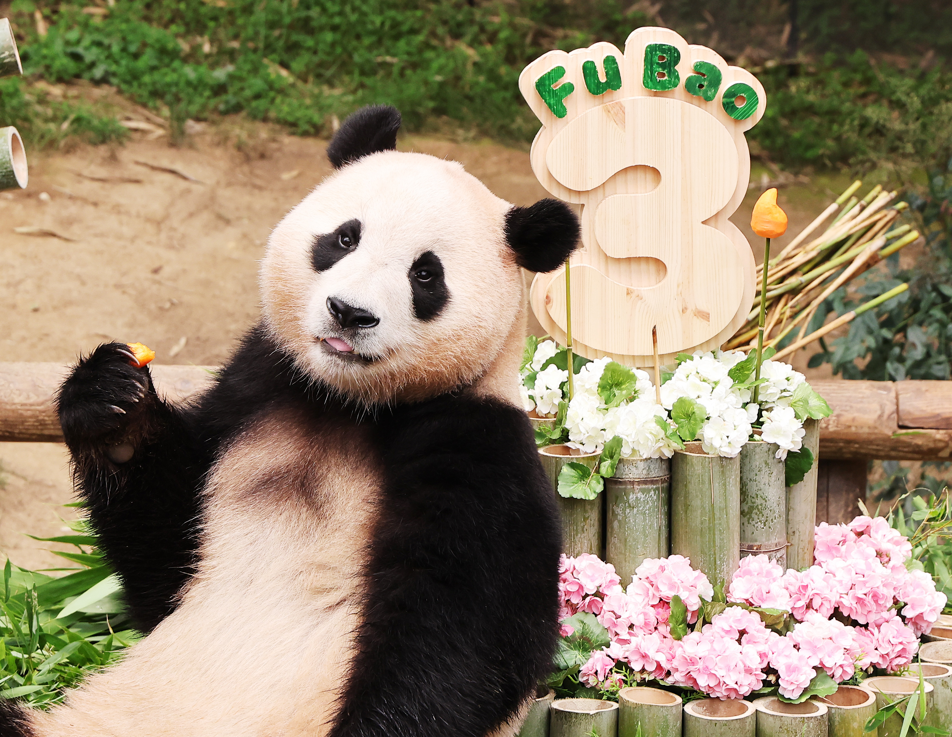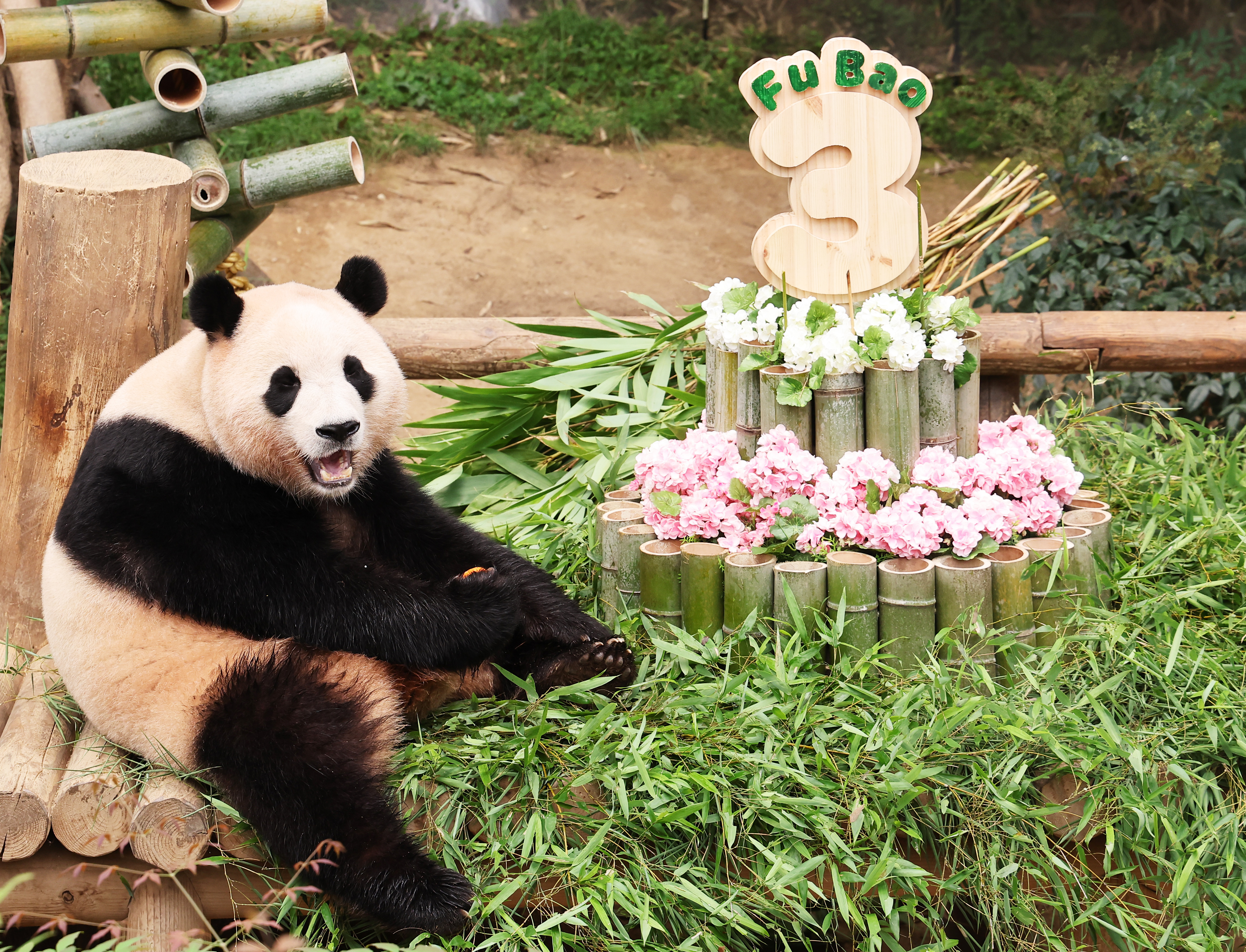 Female panda Fu Bao enjoys a cake prepared by her trainers at Everland in Yongin, 42 km south of Seoul, on her third birthday on July 20, 2023.