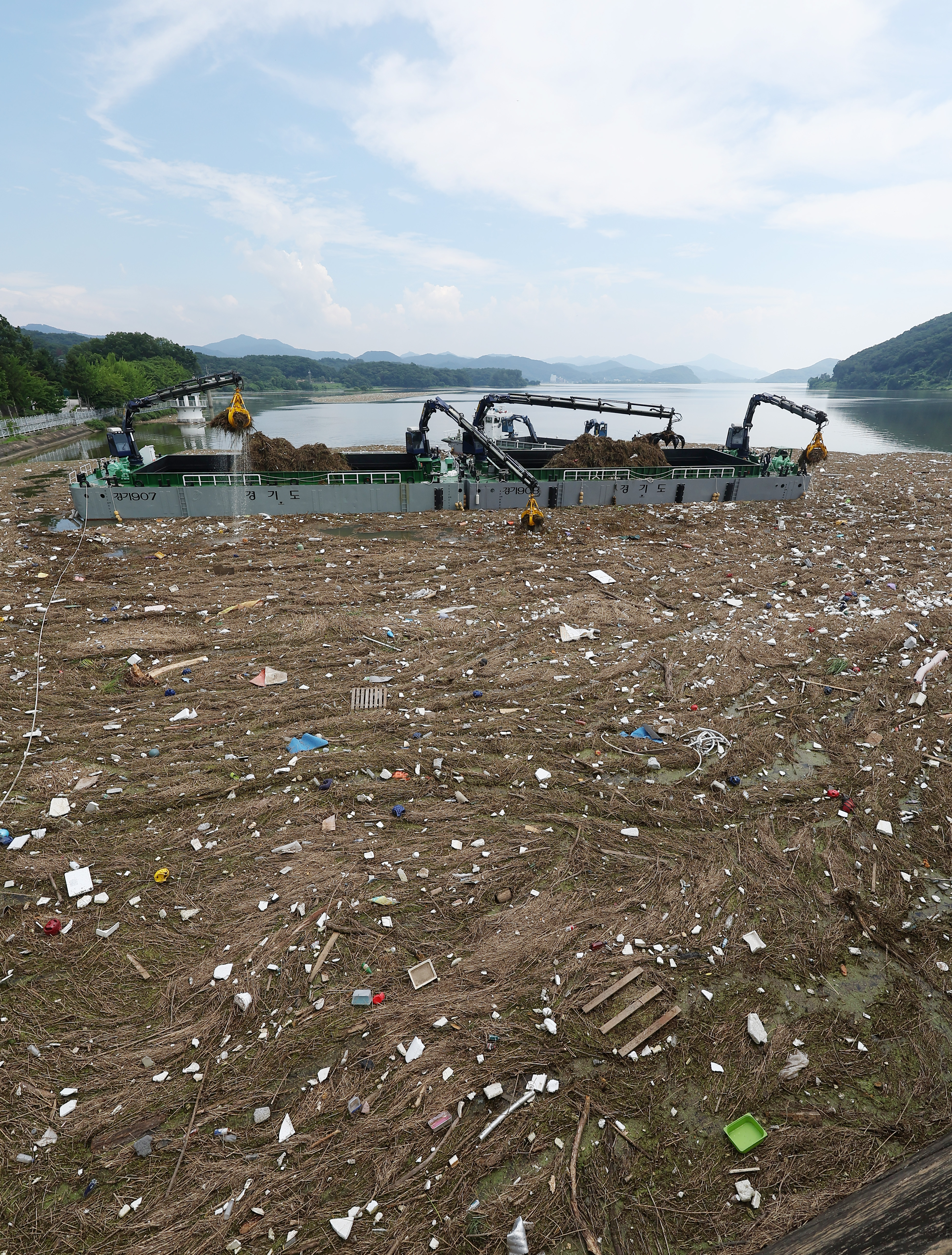 이 쓰레기가 모인 데가 정확히 팔당호 어느 지점인지 모르지만 아마도 물이 흘러나가는 쪽이거나 맴돌이 현상이 있는 데일 것이다.