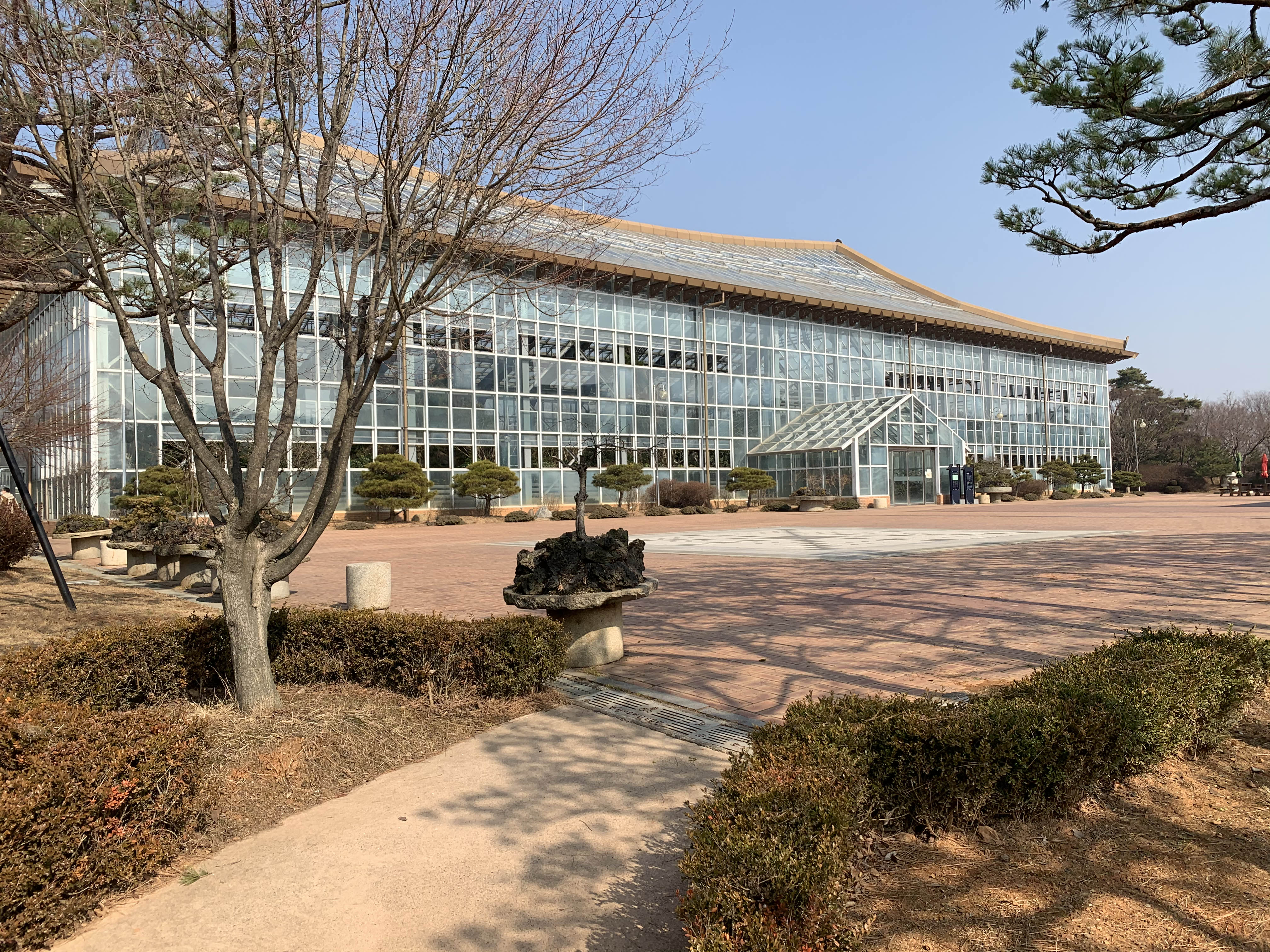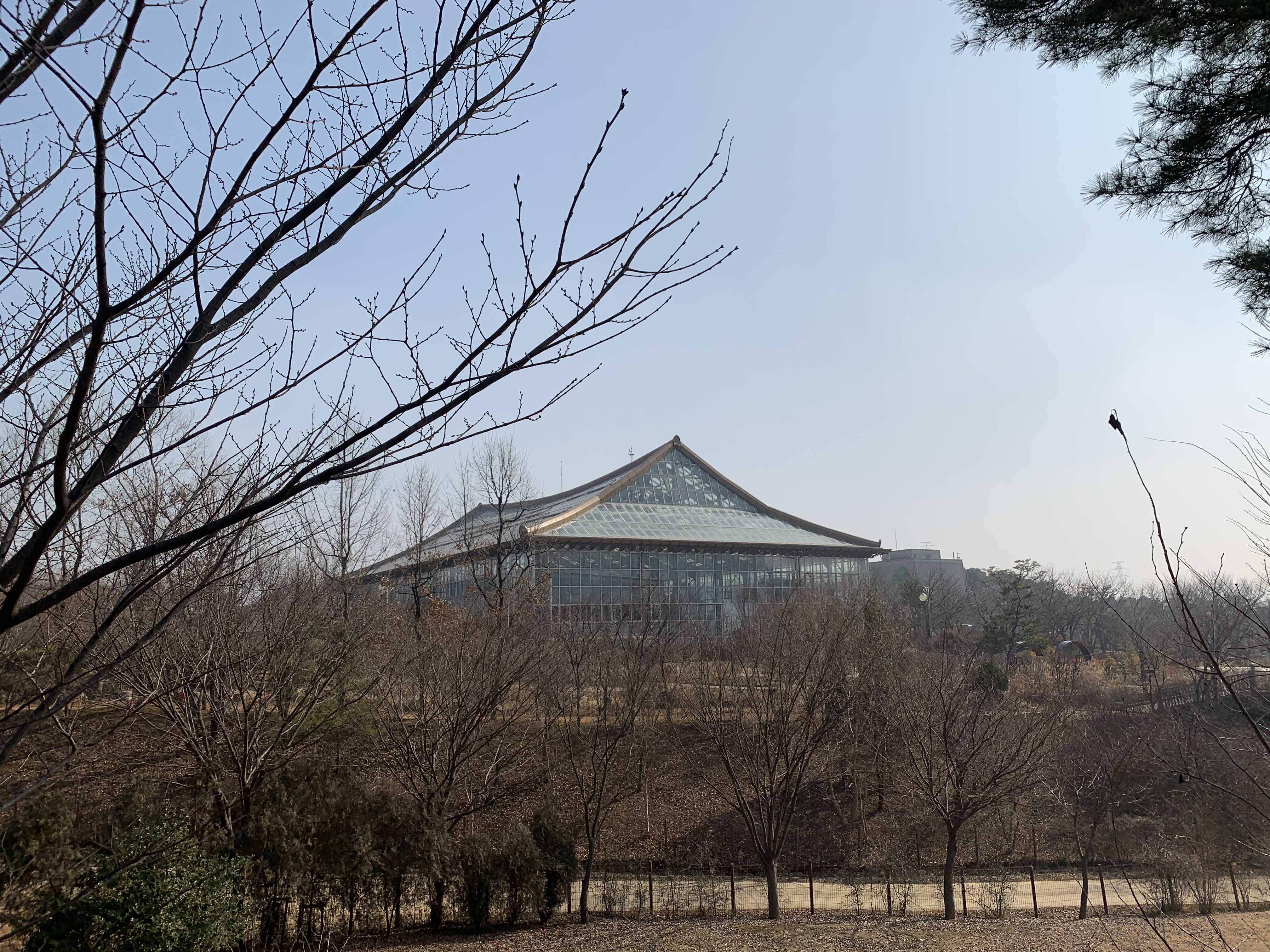 궁궐이나 절에 있는 건축물에서 많이 볼 수 있는 지붕 모양인데, 이렇게 식물원에서 그것도 유리 온실로 만든 팔작지붕을 보니 색다르고 재밌었습니다.
