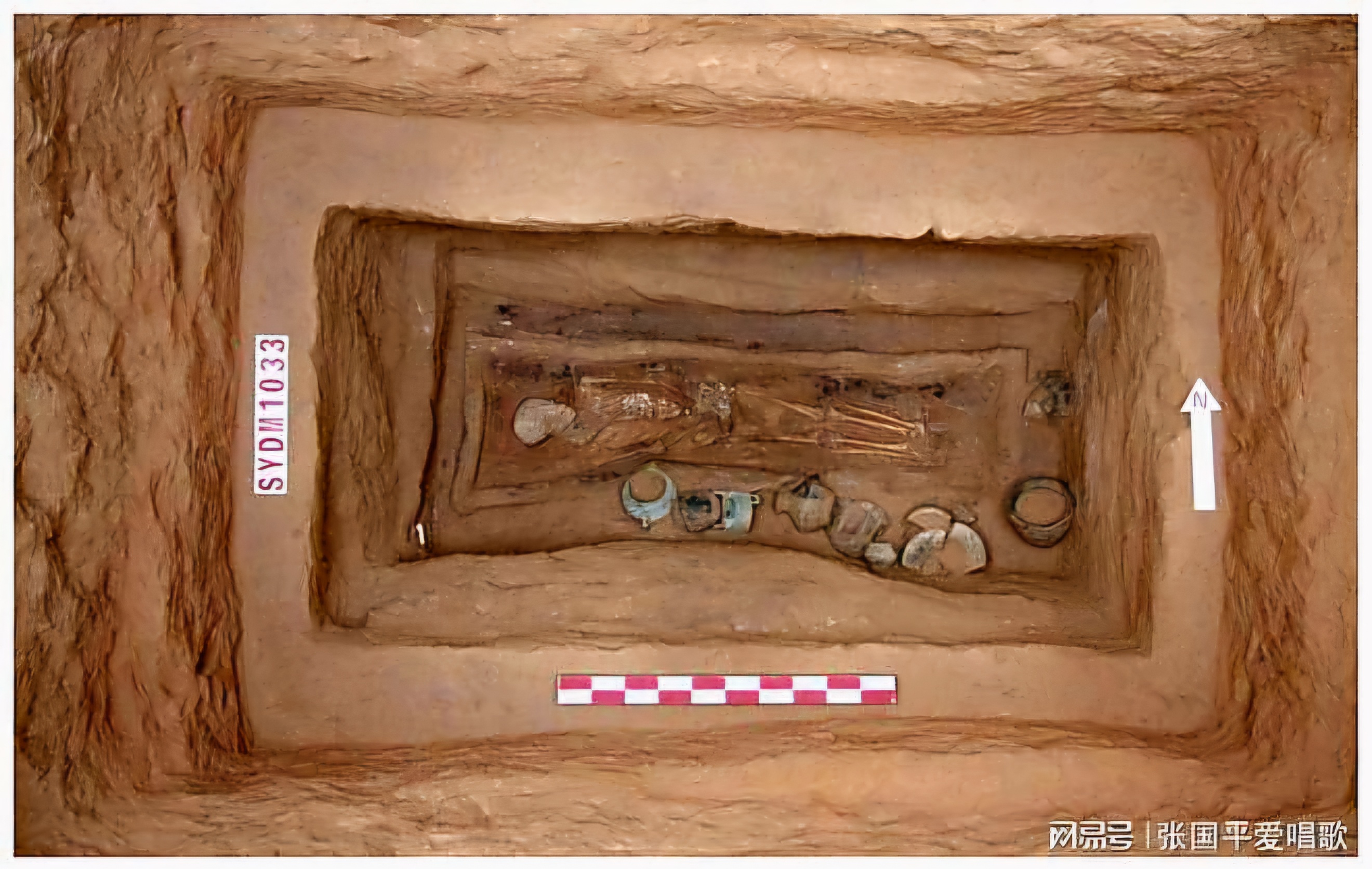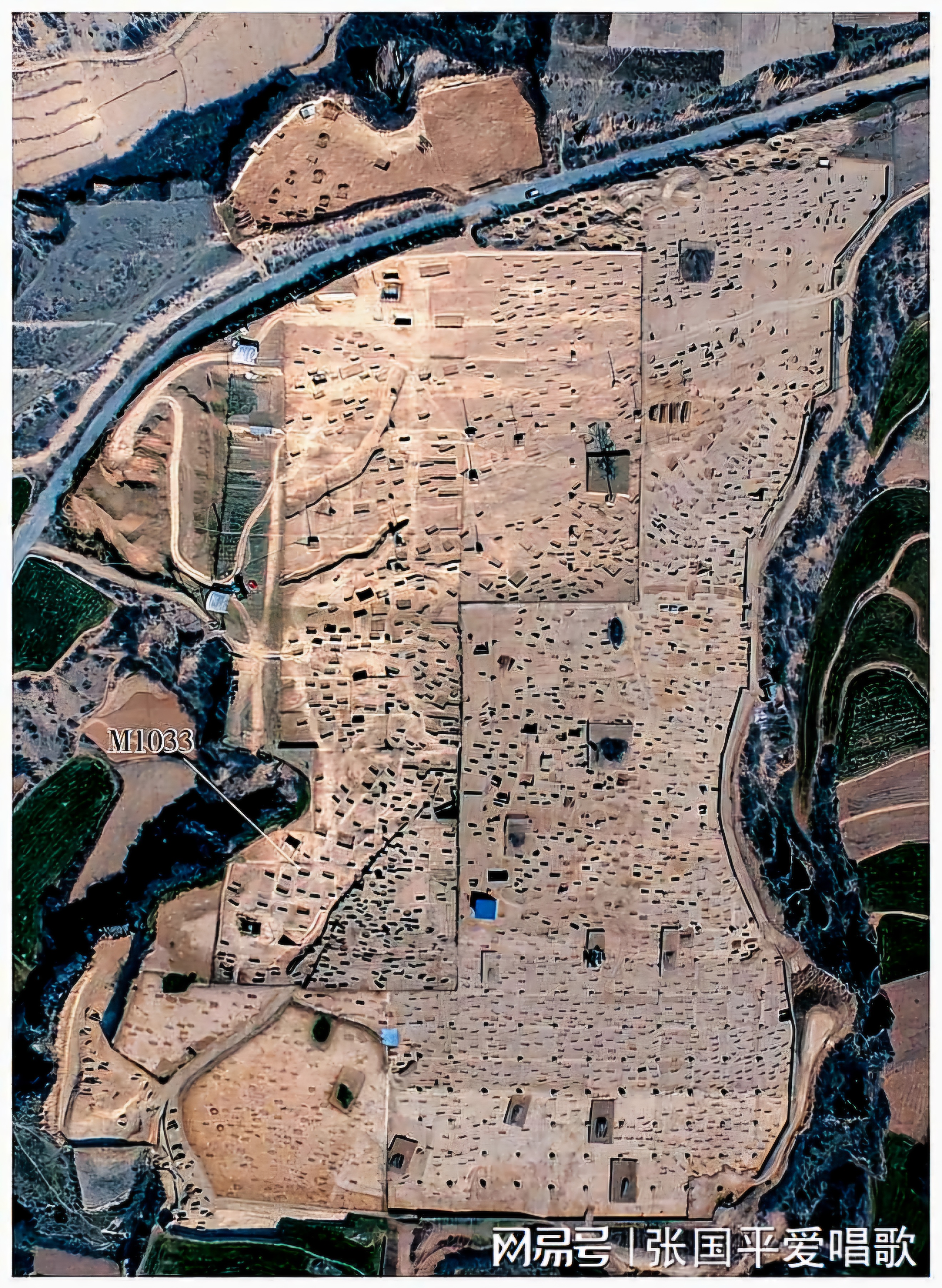개중 1033호묘는 묘지墓地 제1 발굴구역 서북부에 있으며 장방형长方形 수혈토광竖穴土圹을 갖춘 무덤으로 모서리는 약간 둥글게 처리하고 바닥이 입구보다 약간 크며 묘벽은 대략 밖을 향해 경사가 졌다.