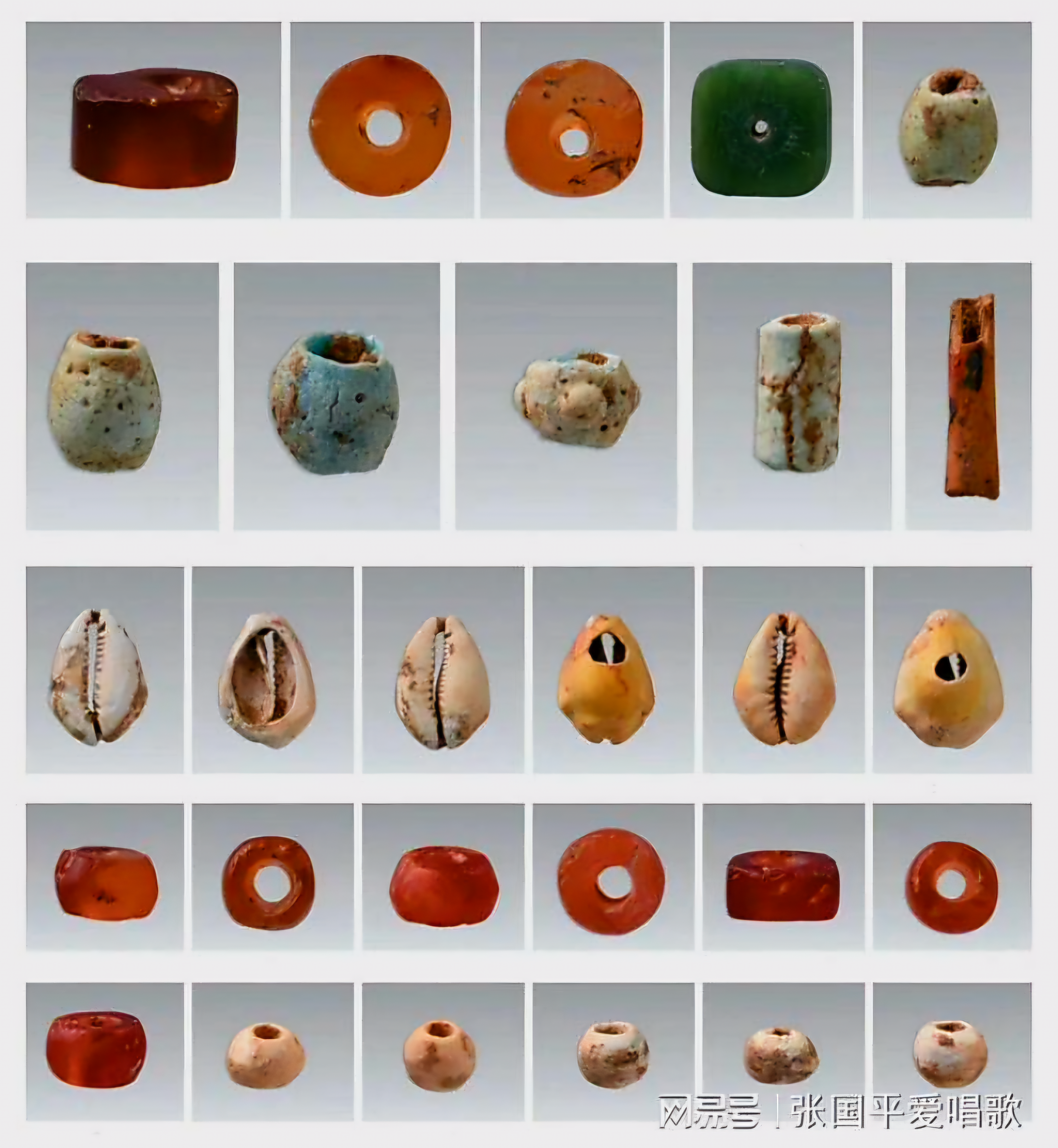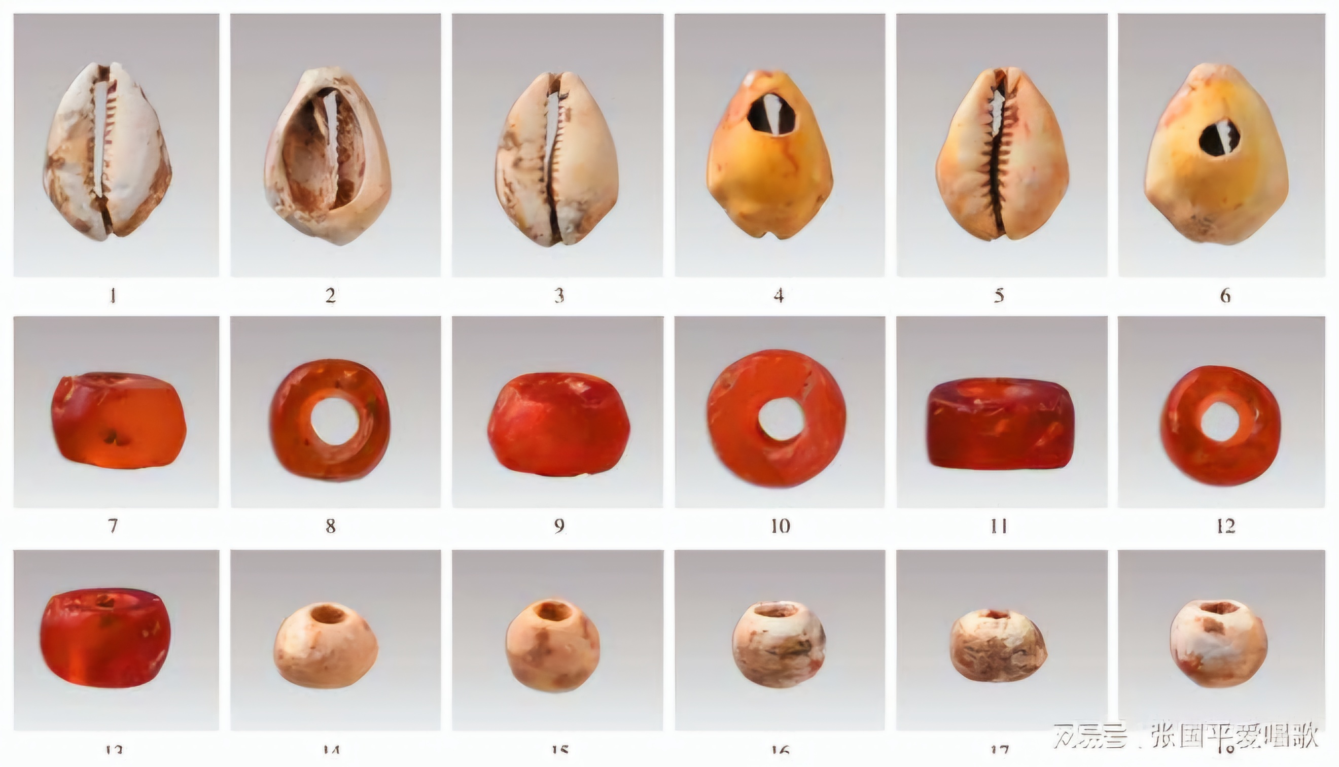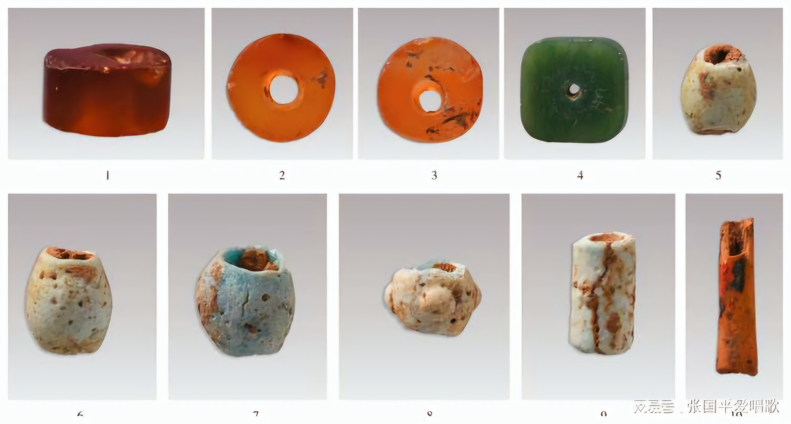 곶식串饰으로는 2组가 있으니 一组 212件이라 마뇌주玛瑙珠·옥방패玉方牌·료주料珠·료관料管·골관骨管이 있고, 다른 1组는 127건이라 해패海贝·마뇌주玛瑙珠·방주蚌珠로 나뉜다.