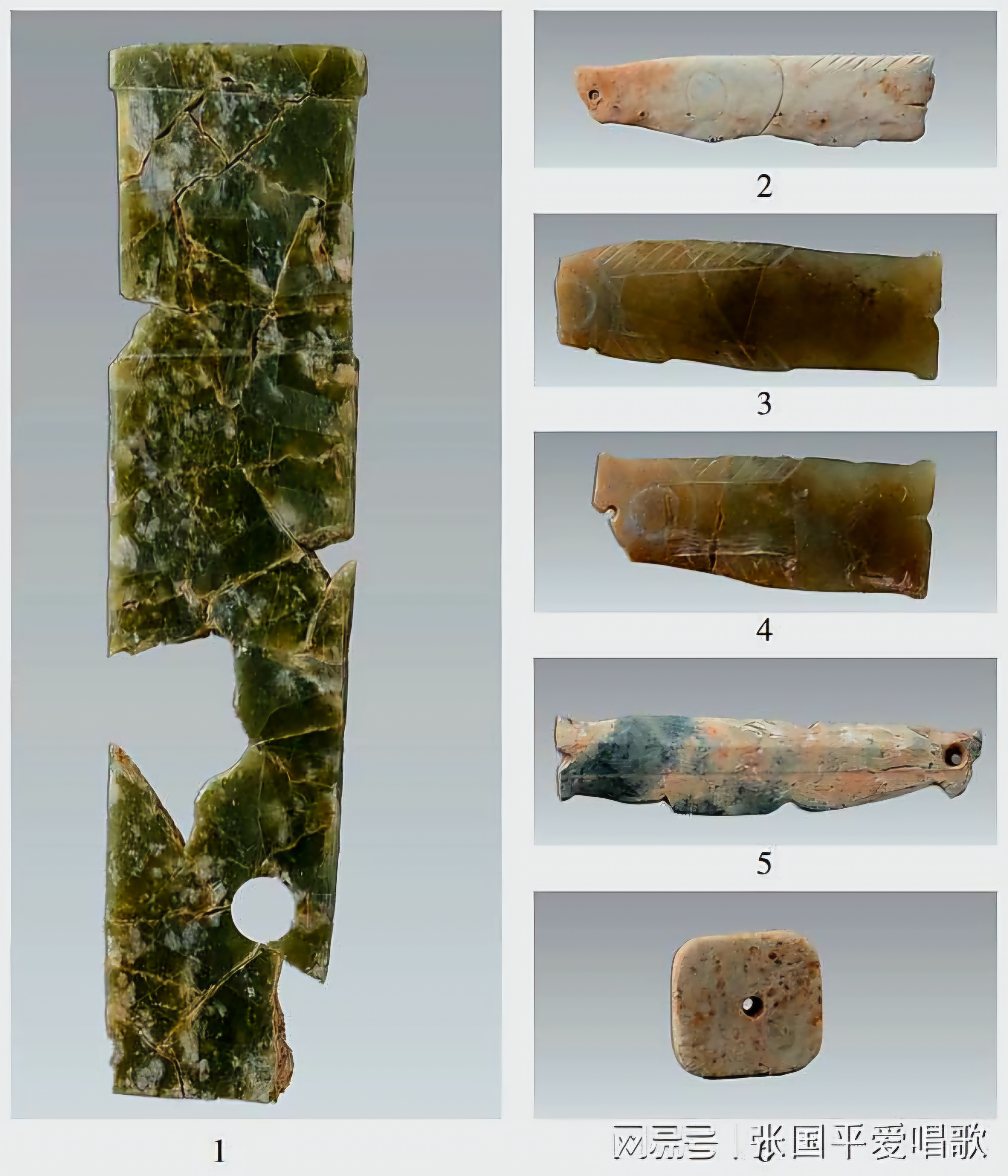 옥기玉器로는 병형기柄形器 1件·어鱼 4件·방패方牌 1件이다.