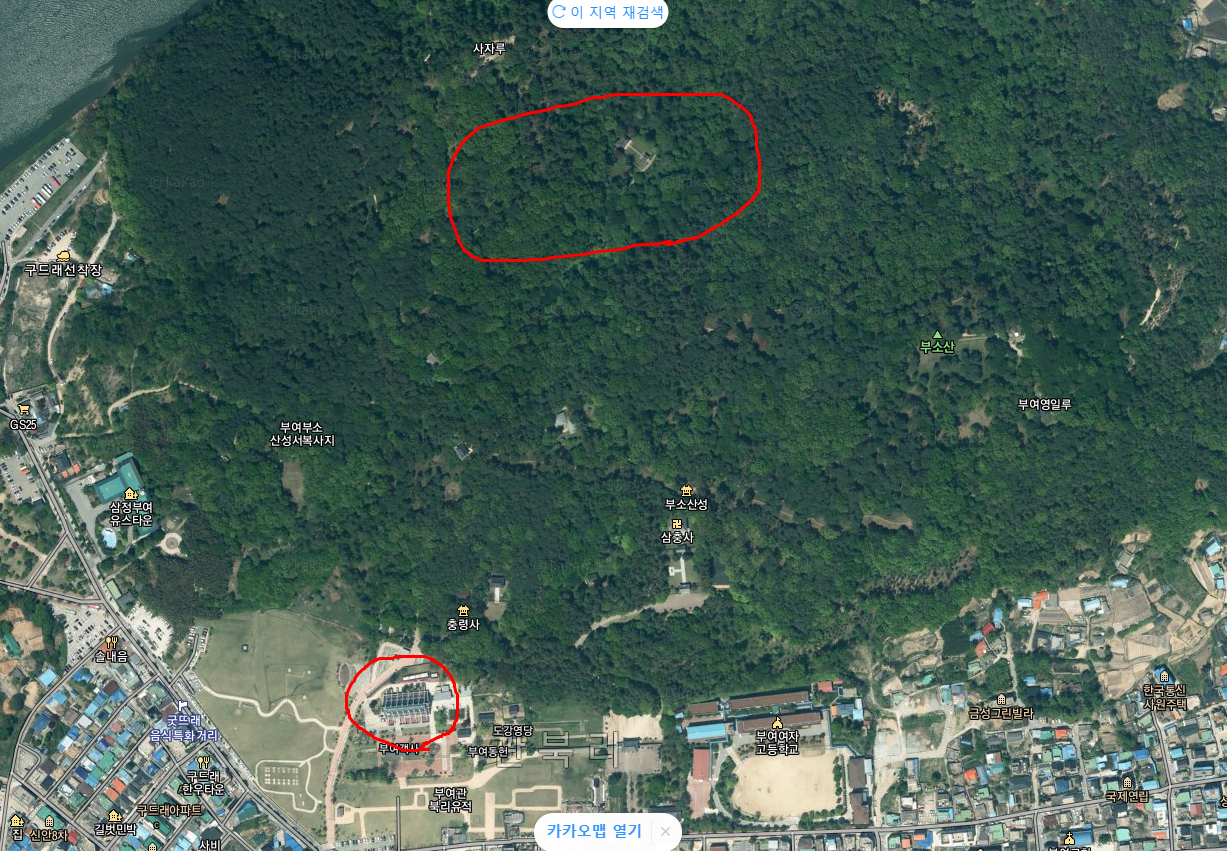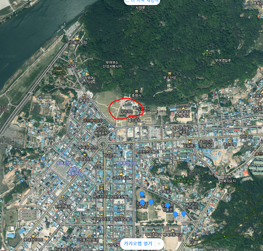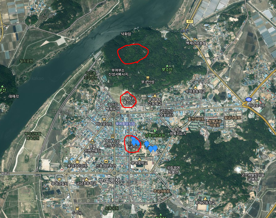 그렇다면 당시 부여현치는 어디였는가? 지금의 관북리유적 인근이 그곳이라 현재도 그 시대를 증언하는 관아 건축물 일부가 남았다. 아래 지도에서 부여객사라고 표시된 지점이 그곳이다.